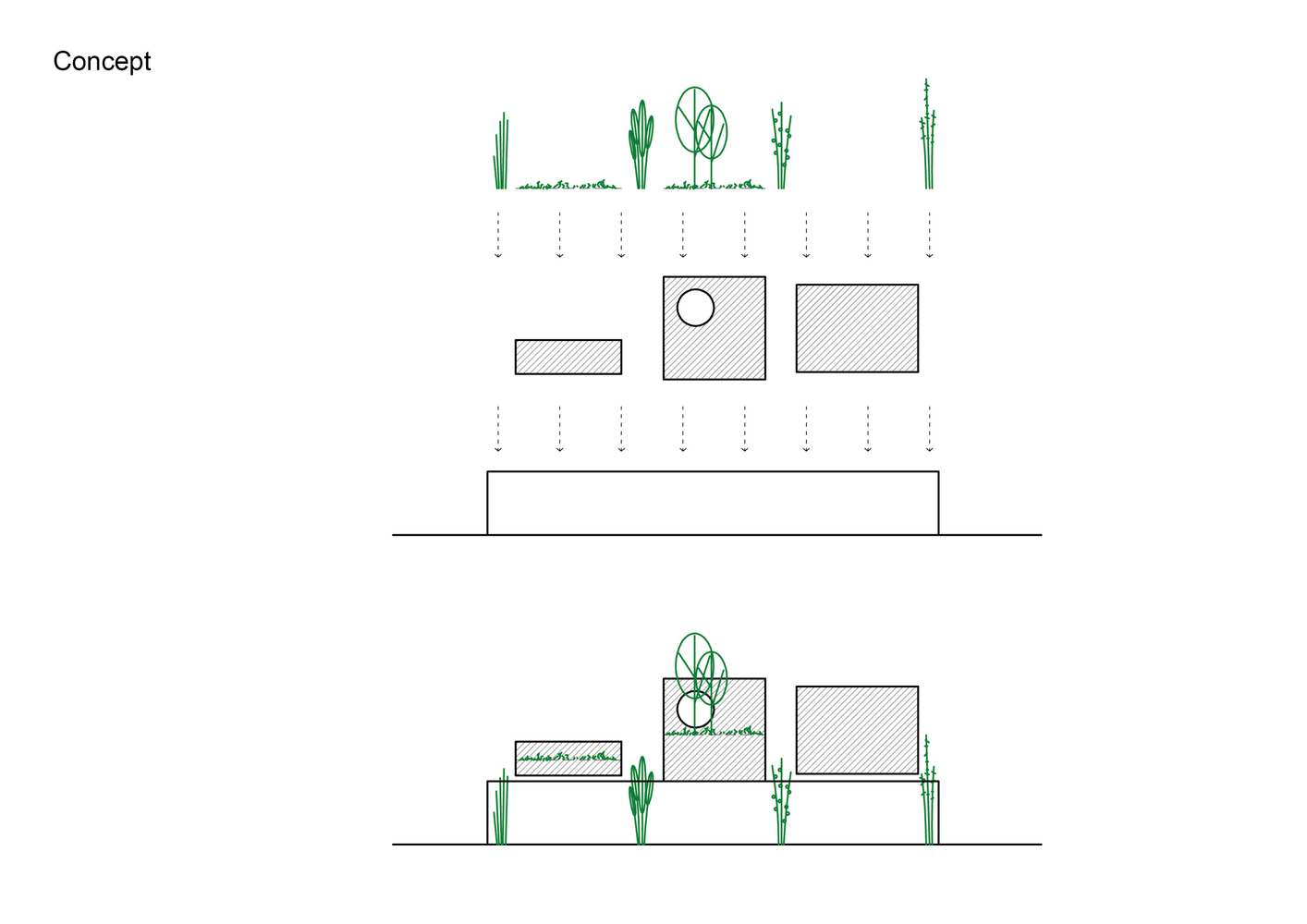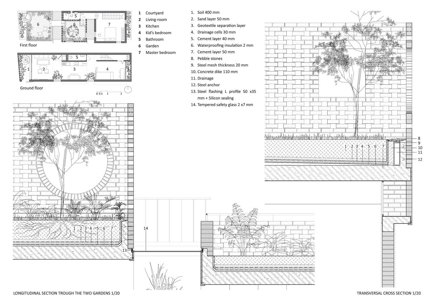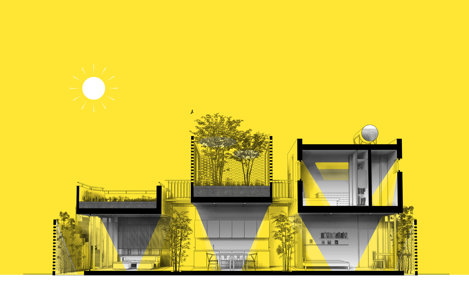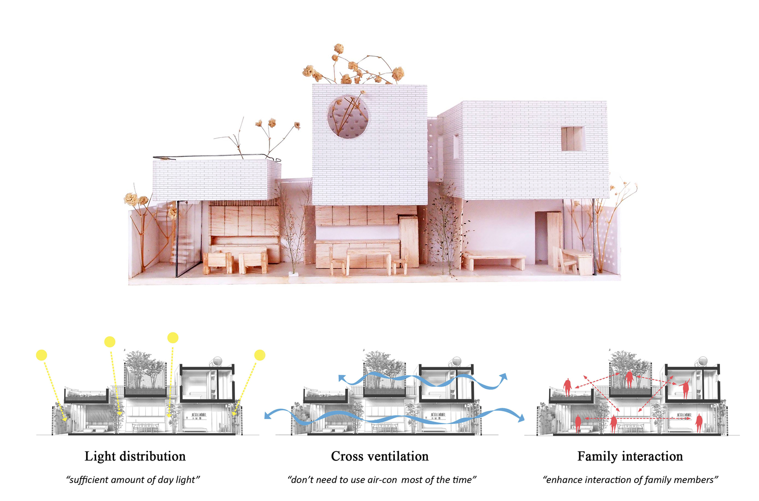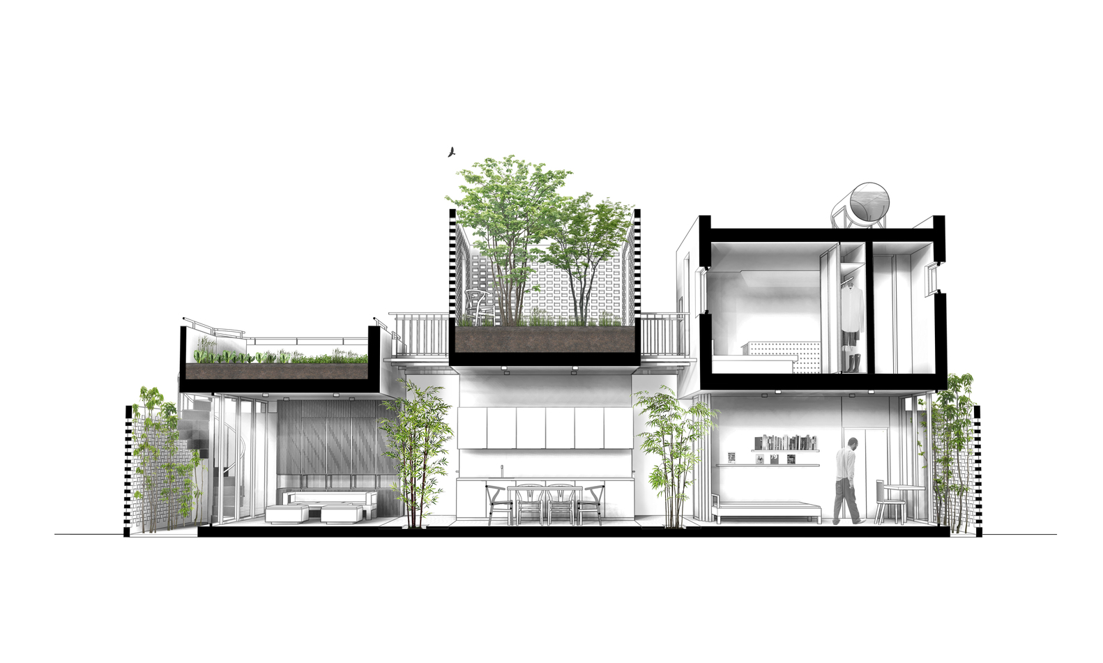 Được lấy cảm hứng từ ngôi nhà ống truyền thống, có cân nhắc các yếu tố kiến trúc đương đại phản ánh phong cách sống hiện đại. Ngôi nhà ống truyền thống được thiết kế với các khoảng sân mở ở giữa bố trí cho phép luồng không khí và ánh sáng tự nhiên lan tỏa khắp ngôi nhà, lý tưởng với khí hậu cận nhiệt đới của địa phương. Một không gian sống liên hoàn được phân chia bởi những khoảng sân xanh nhỏ bên ngoài và bên trong. Khu vực mái được bao phủ bởi các khu vườn mở, nơi gia đình có thể tự trồng rau và trái cây.