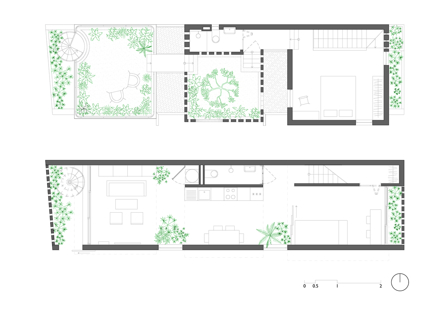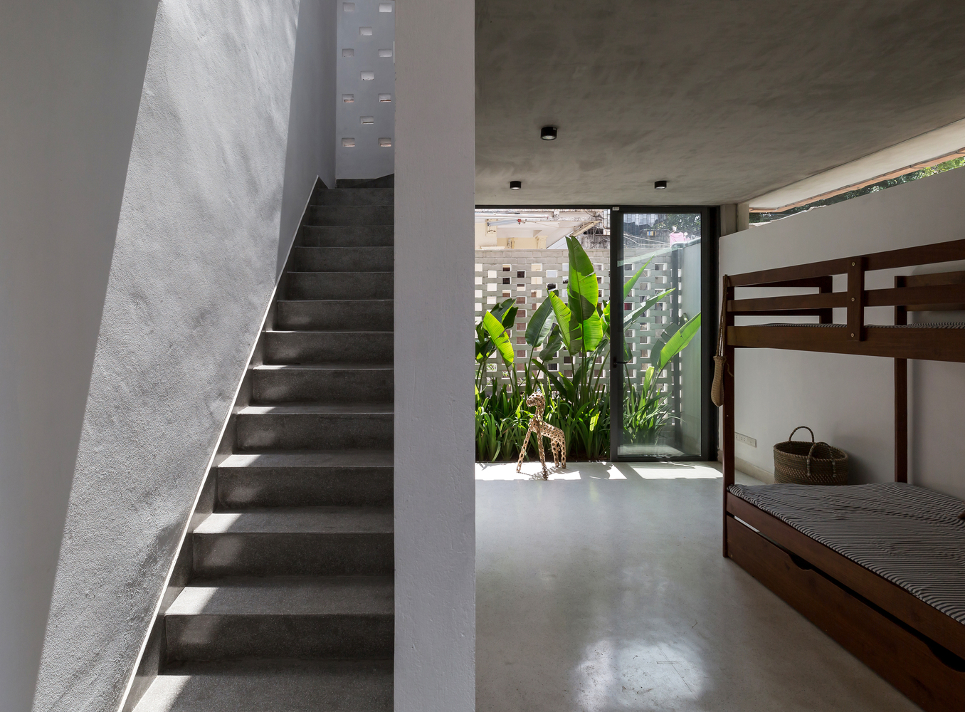 Thửa đất của ngôi nhà tương đối hẹp chỉ 4,1m. Mục đích là tạo ra một không gian mở thông thoáng ở tầng trệt để người ở có cảm giác rộng rãi về không gian dù là một ngôi nhà nhỏ. Vì thế thay vì dùng các bức tường., nhóm KTS để các loại cây và thực vật có chức năng phân chia không gian một cách trực quan.