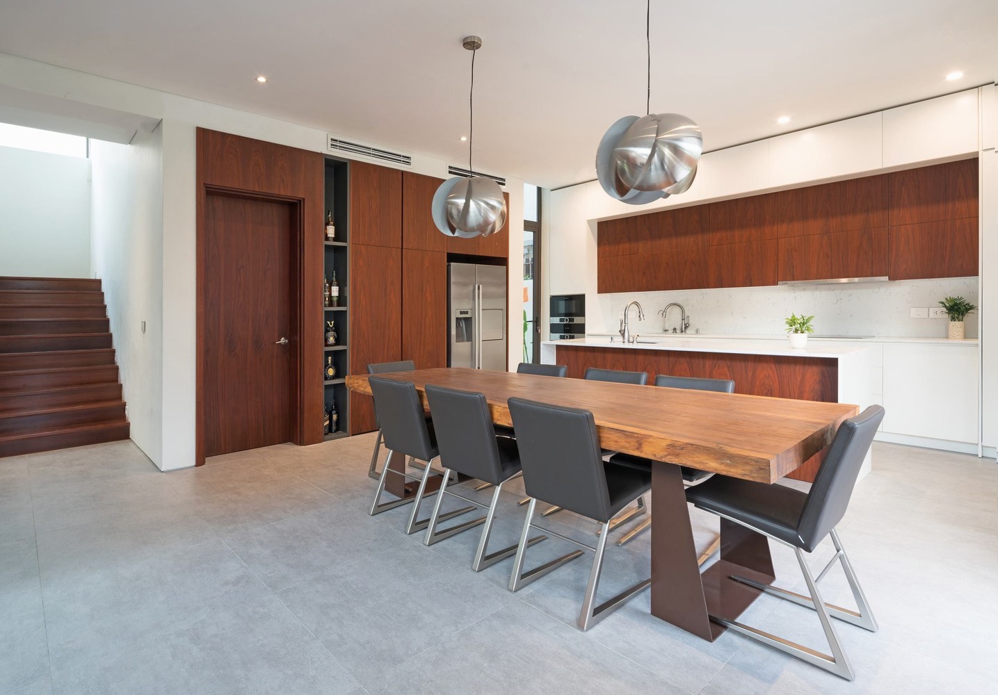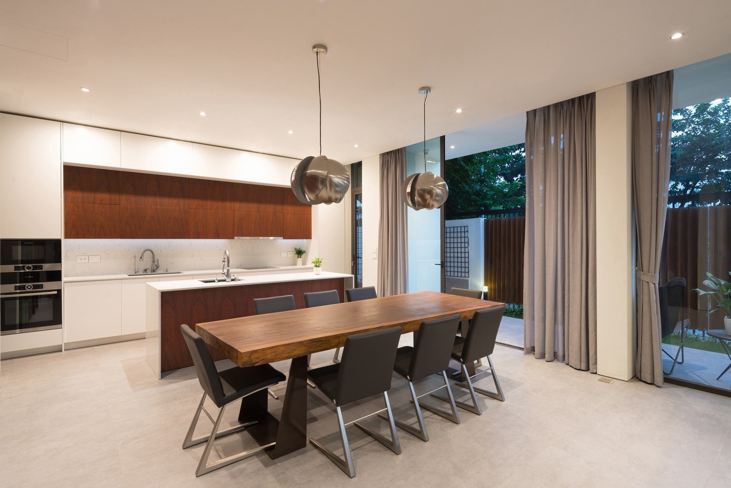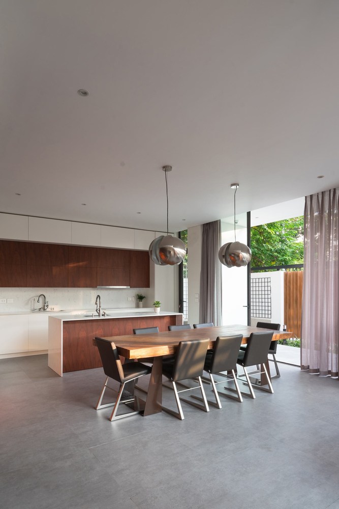 Phòng khách ở tầng 1 và nhà bếp được kéo dài bởi mái thái rộng và được tiếp nối bằng mái bê tông dài dọc theo ngôi nhà. Nhờ đó, không gian sử dụng được mở rộng và xóa ranh giới giữa bên trong và bên ngoài của khu vườn.
