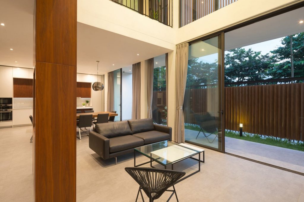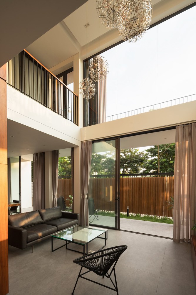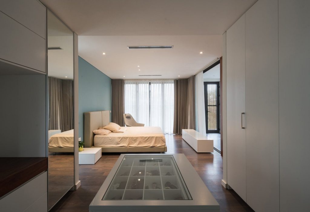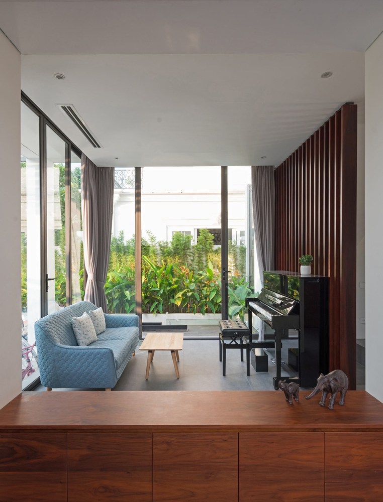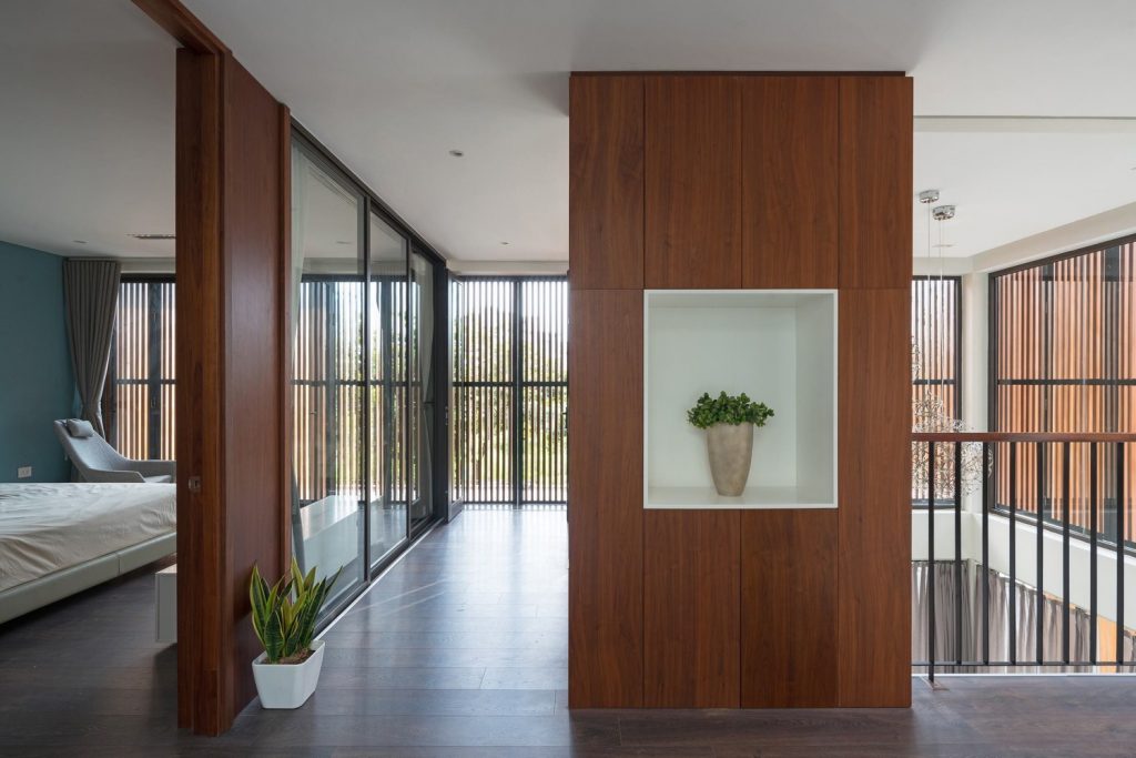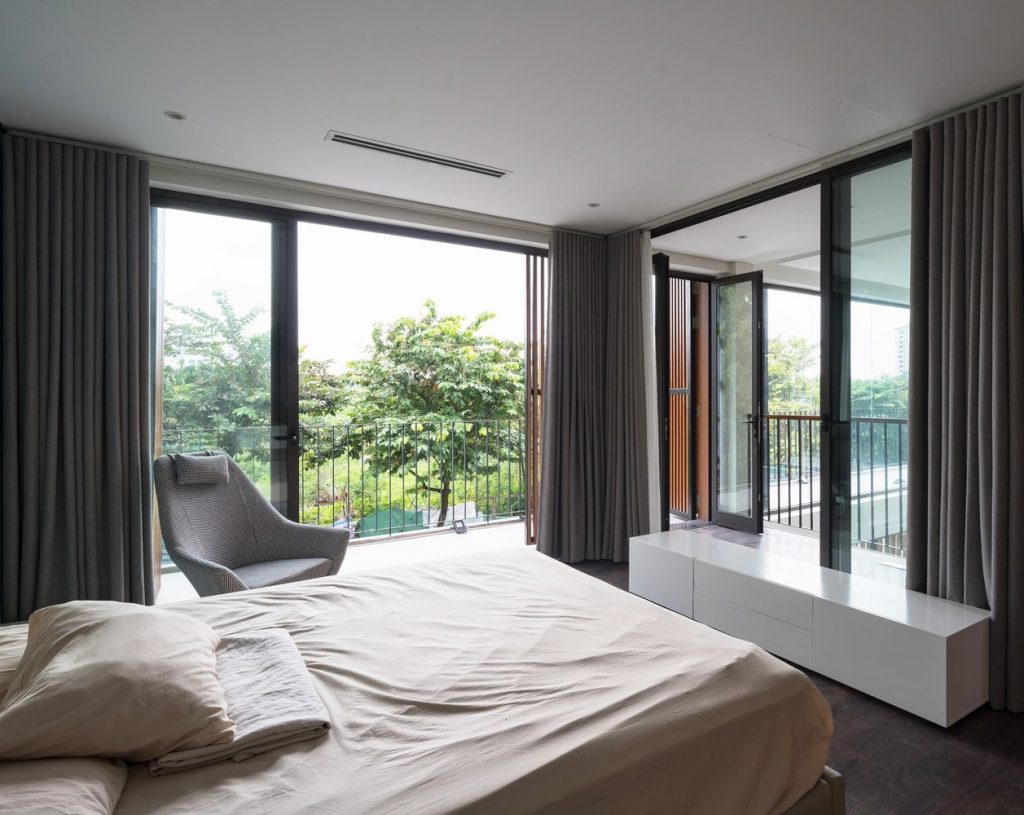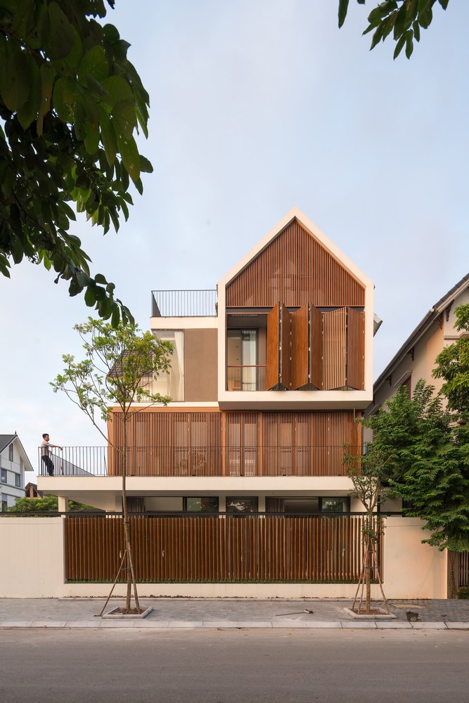 Toàn bộ mặt tiền biệt thự được sử dụng hệ thống lam linh hoạt, có thể đóng mở rộng, điều chỉnh được ánh sáng vào nhà và đảm bảo an ninh. Tùy thuộc vào thời tiết và cảm giác, ngôi nhà có thể mở hoặc đóng với thiên nhiên bên ngoài.