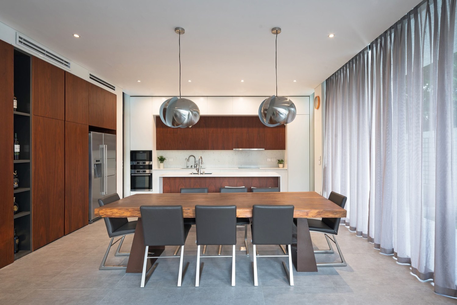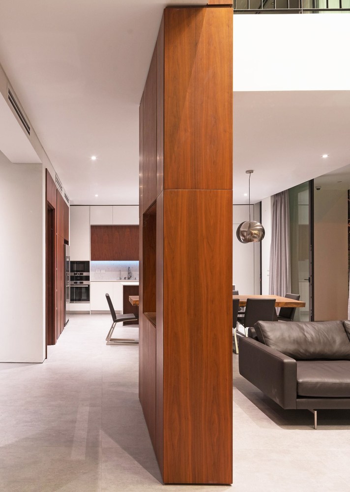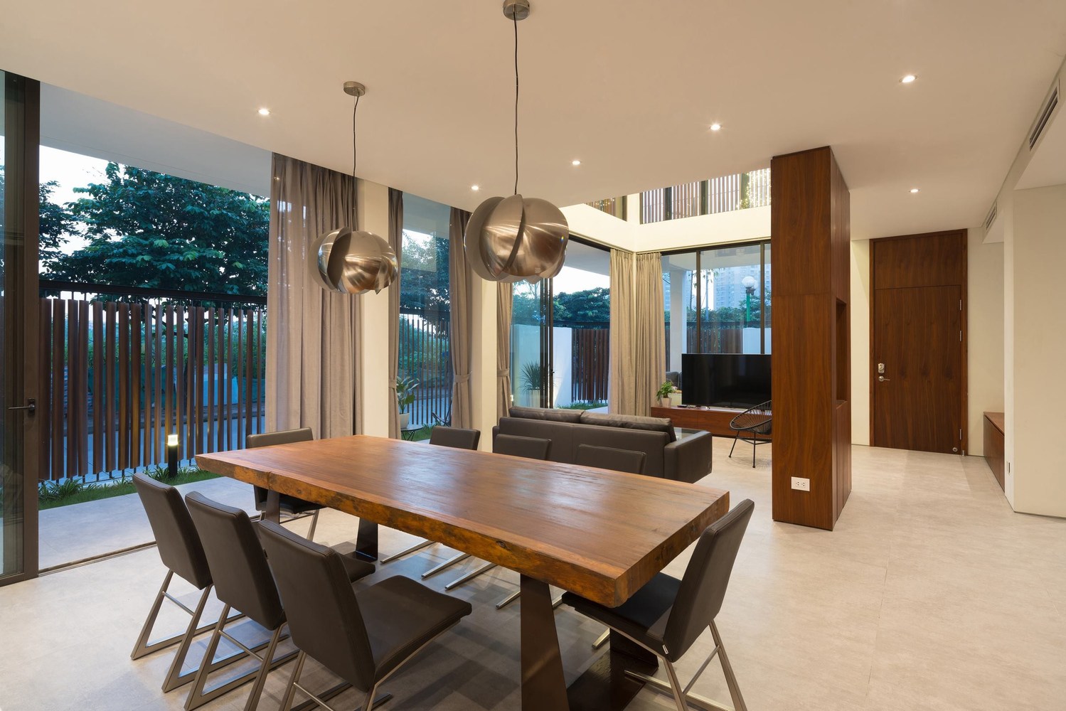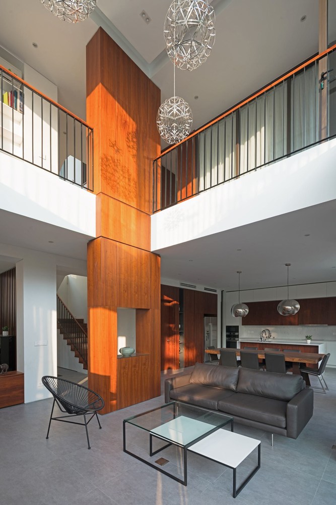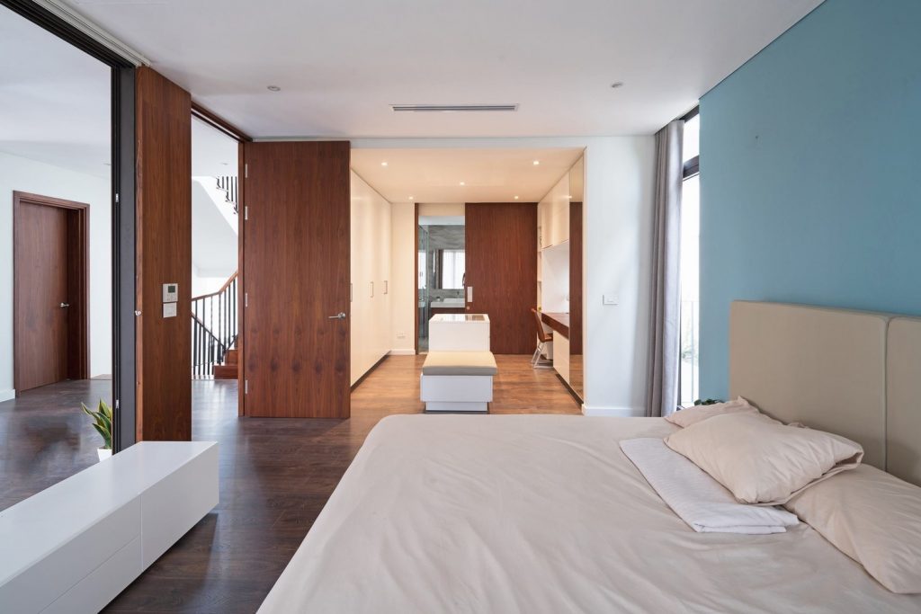Toàn bộ mặt tiền biệt thự được sử dụng hệ thống lam linh hoạt, có thể đóng mở rộng, điều chỉnh được ánh sáng vào nhà và đảm bảo an ninh. Tùy thuộc vào thời tiết và cảm giác, ngôi nhà có thể mở hoặc đóng với thiên nhiên bên ngoài.