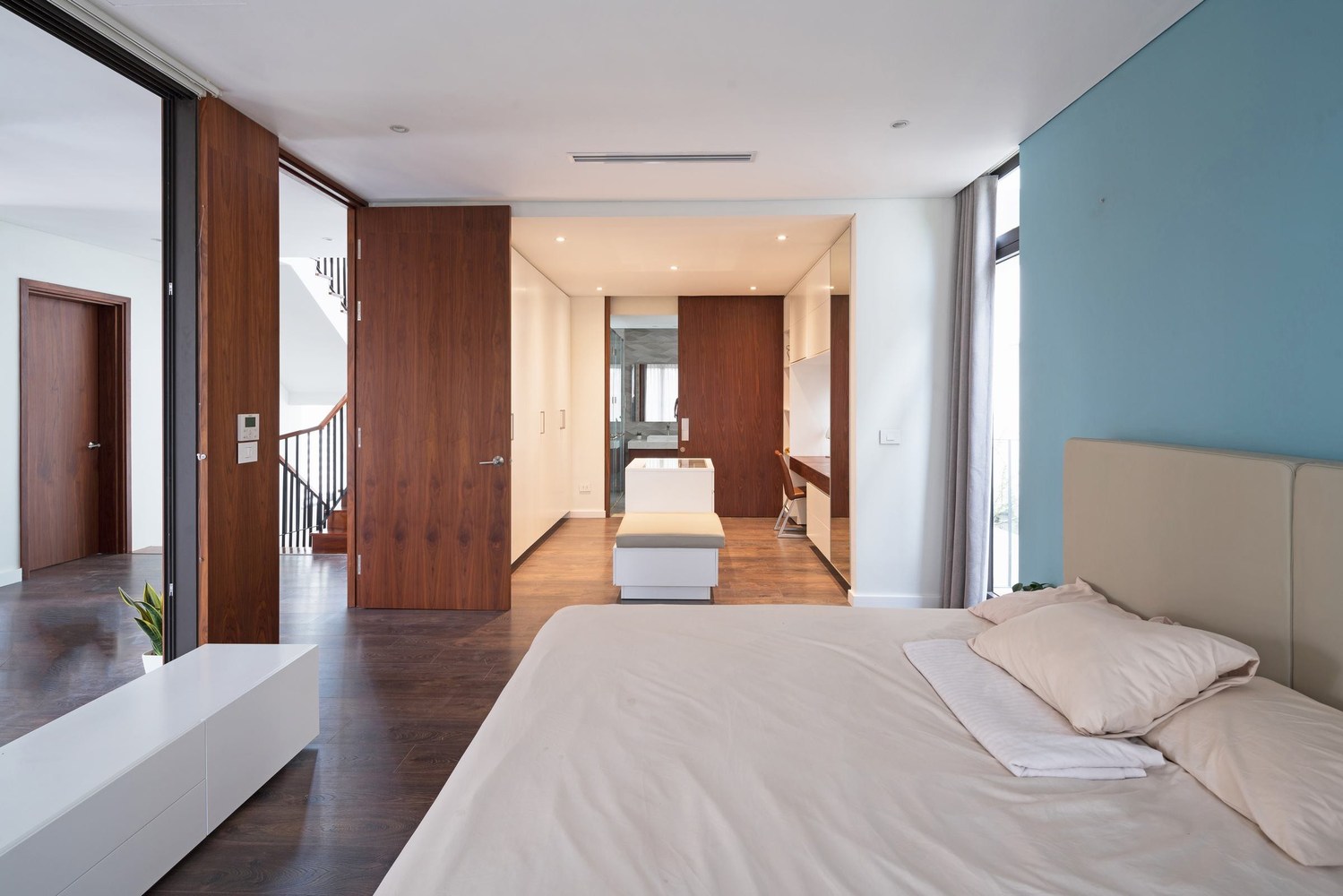 Phòng ngủ chính được bố trí linh hoạt và kết nối với tầng một bằng một không gian song lập. Khi cần thiết có thể mở rộng ra hành lang mà vẫn giữ được tầm nhìn ra đồng cỏ xung quanh.