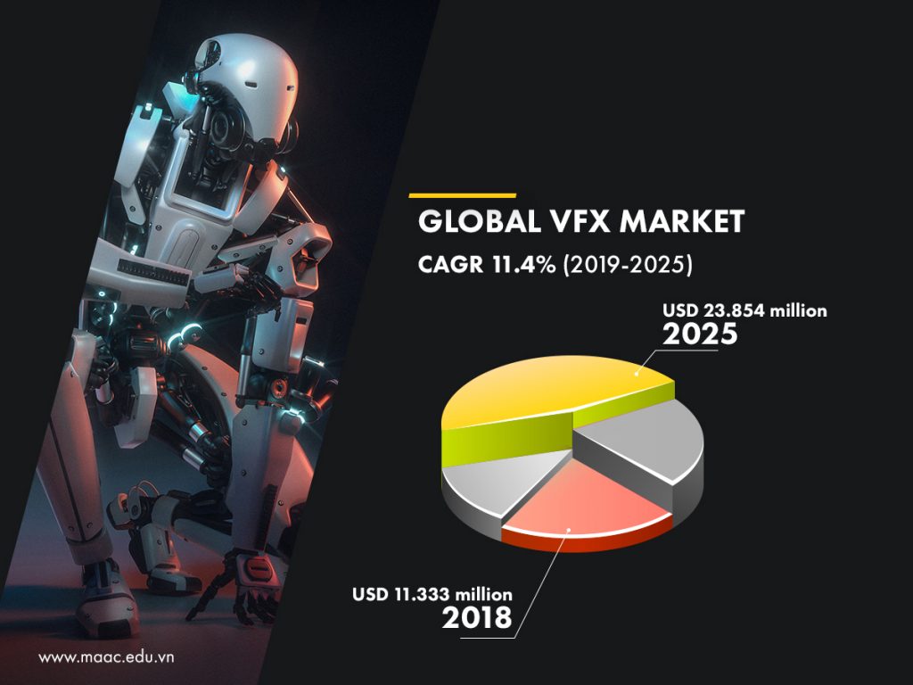 Ngành công nghiệp sáng tạo là tương lai nghề nghiệp của thế giới, một lĩnh vực có thể đứng vững trong mọi biến cố của thời cuộc. Ngay cả trong tình huống cả thế giới phải đối mặt với nhiều nguy cơ đe dọa từ đại dịch Covid-19, ngành công nghiệp sáng tạo vẫn vững vàng tăng trưởng. Theo số liệu cung cấp từ Business Wire, tổng giá trị toàn cầu của ngành công nghiệp VFX, Animation và Video Games nói riêng trong lĩnh vực sáng tạo đã chạm đến con số 261 tỷ USD vào năm 2020, tốc độ tăng trưởng vẫn ổn định với mức 2-3%/năm. Theo Zion Market Research, chỉ riêng thị trường VFX trên toàn cầu trong năm 2018 đã đạt được thị phần có giá trị khổng lồ lên đến 11.333 triệu USD, dự kiến sẽ tăng 23.854 triệu USD vào năm 2025.