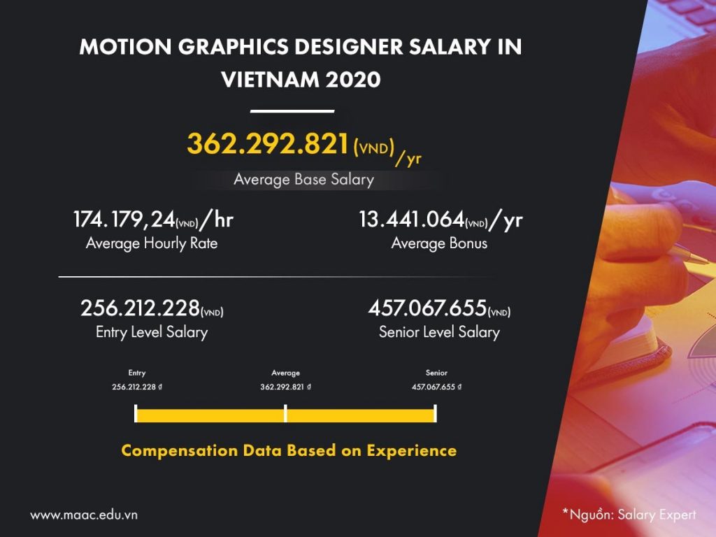 Chịu ảnh hưởng từ xu hướng chọn lựa sản phẩm nghe – nhìn chung của thị trường thế giới, tại thị trường Việt Nam, Motion Graphics cũng đang là một trong những nhóm ngành được các Agency quảng cáo, truyền thông, xây dựng website, các doanh nghiệp bán lẻ, đơn vị giáo dục và hầu hết các doanh nghiệp cần đến sự hỗ trợ của Marketing ưu tiên tuyển dụng. Trên các kênh tuyển dụng uy tín tại Việt Nam như Vietnamworks, Careerbuilder, Myworks, Topcv.vn hay Indeed, nhu cầu tuyển dụng Designer trải rộng trên hầu hết tất cả các lĩnh vực, trong đó vị trí Motion Graphics và 3D Designer đang rất được ưu tiên với mức lương không dưới 12.000.00 đồng/tháng, cao nhất có thể lên đến 25.000.000 đồng/tháng đối với các ứng viên có nhiều năm kinh nghiệm. Bên cạnh đó, theo số liệu thống kê mới đây của kênh Salary Expert, mức lương trung bình năm cho vị trí Motion Graphics Designers tại Việt Nam rơi vào khoảng hơn 300.000.000 đồng/năm. Đối với vị trí chuyên viên (Senior), mức lương có thể lên tới hơn 450.000.000 đồng/năm.
