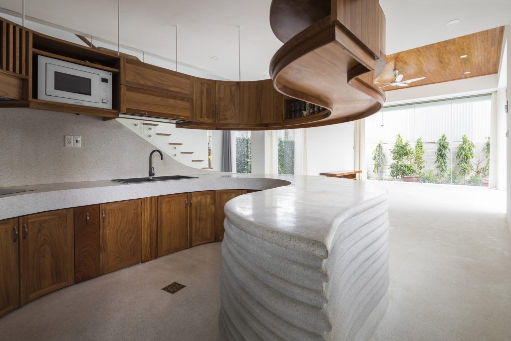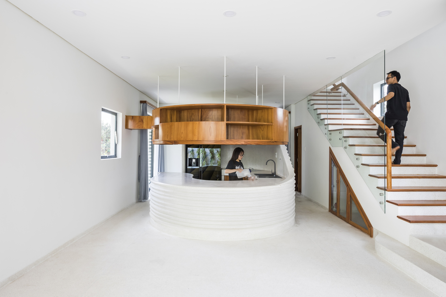Sẽ có ba gia đình sinh sống ở đây trong tương lai. Vì vậy KTS tạo ra một không gian sinh hoạt chung, ấm áp và dễ tiếp cận đó chính là không gian bếp và phòng khách. Được đặt ở giữa nhà, có hành lang bao quanh, với các không gian đóng mở xen kẽ, các thành viên trong gia đình có thể dễ dàng gặp gỡ, trao đổi, trò chuyện với nhau.