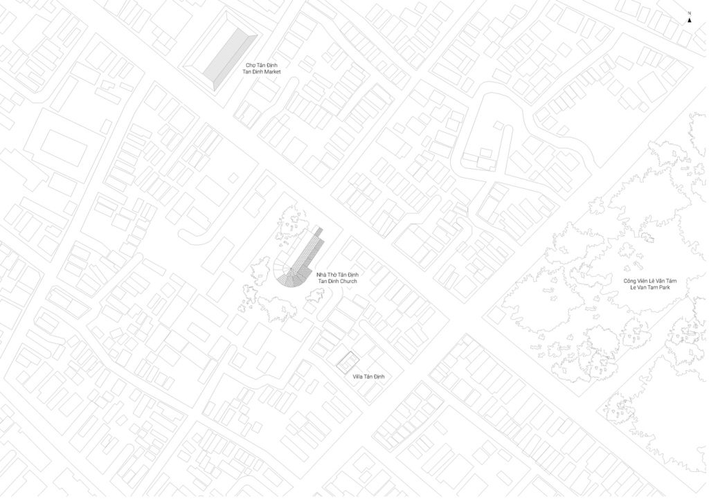 Một đặc điểm nổi bật khác, vị trí tiếp giáp với các công trình kiến trúc lịch sử của Sài Gòn như Nhà thờ Tân Định, Chợ Tân Định. Ngoài ra, căn nhà nằm giữa quận 3 được coi là khu vực “đông đúc” nhất của thành phố. Vào sáng sớm hay chiều tà, bạn có thể nghe rõ tiếng chuông từ Nhà thờ, hoặc chỉ cần bước ra khỏi nhà vài bước chân là bạn có thể trực tiếp chạm vào không khí “hẻm” Sài Gòn, có thể xem là một đặc sản của Văn hóa đô thị.