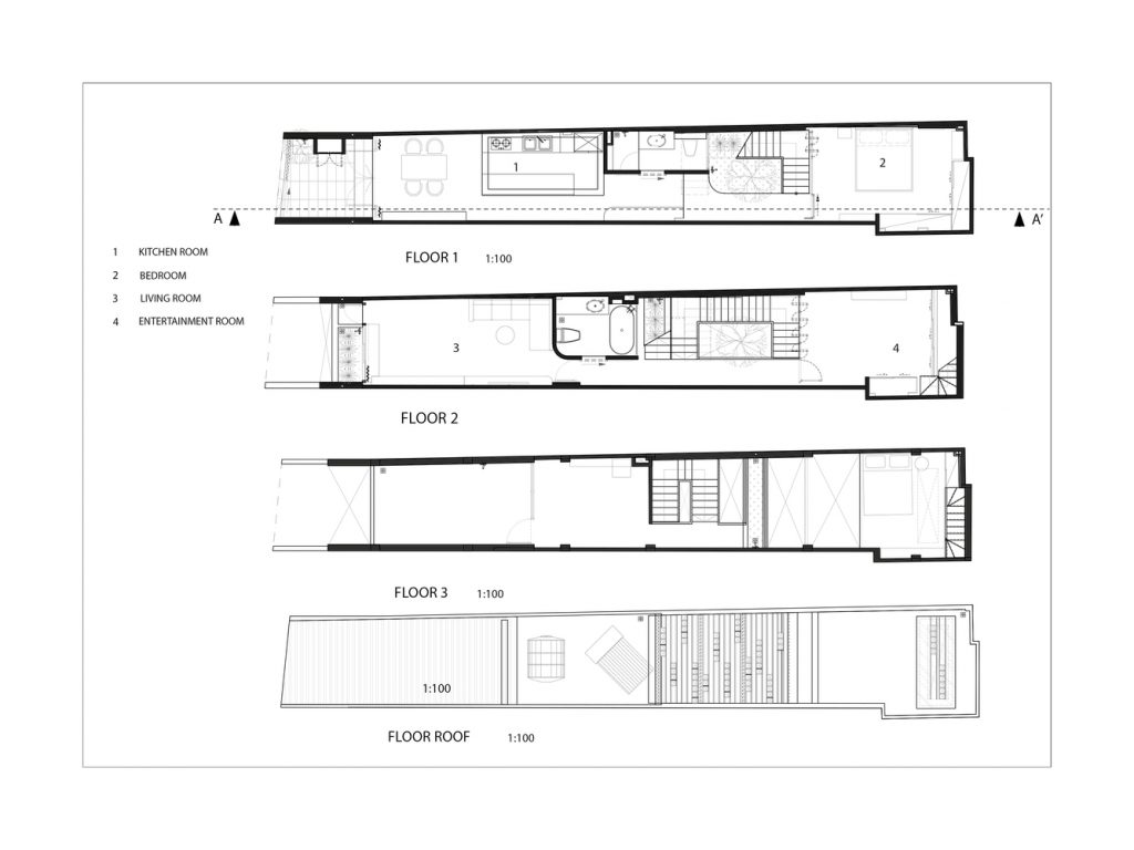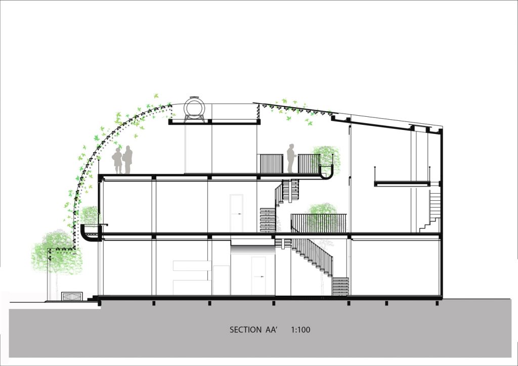 Do ít có nhu cầu về không gian sinh hoạt nên Vy Anh House được vát dần về phía trên để giảm diện tích các tầng trên. Kết quả là mặt tiền cong cho phép ánh sáng tự nhiên vào sâu trong ngôi nhà ống dài và hẹp này. Gia chủ có thể tận hưởng tầm nhìn ra ốc đảo bên trong này từ bất kỳ phòng nào trong ngôi nhà của họ.