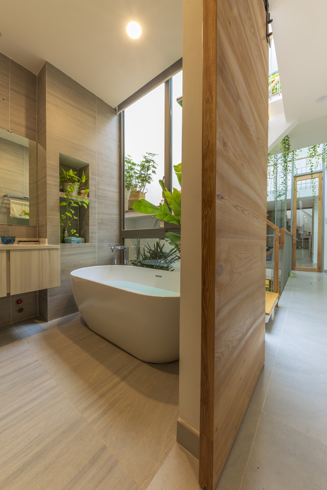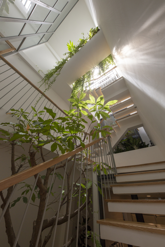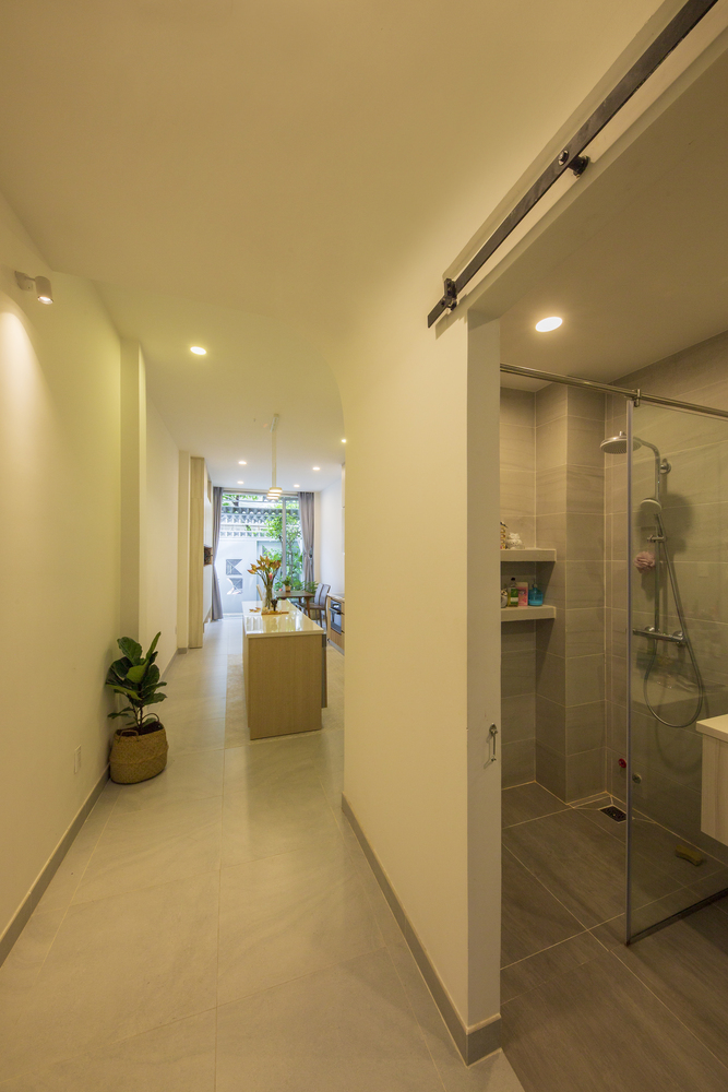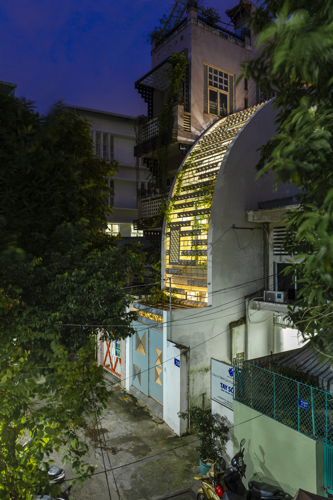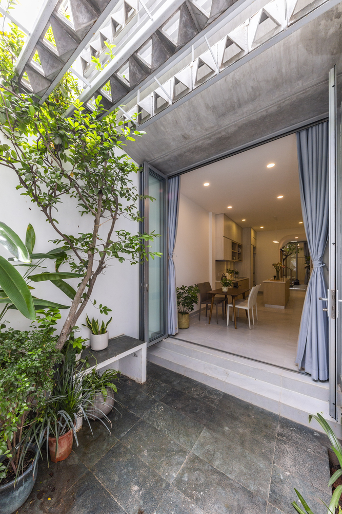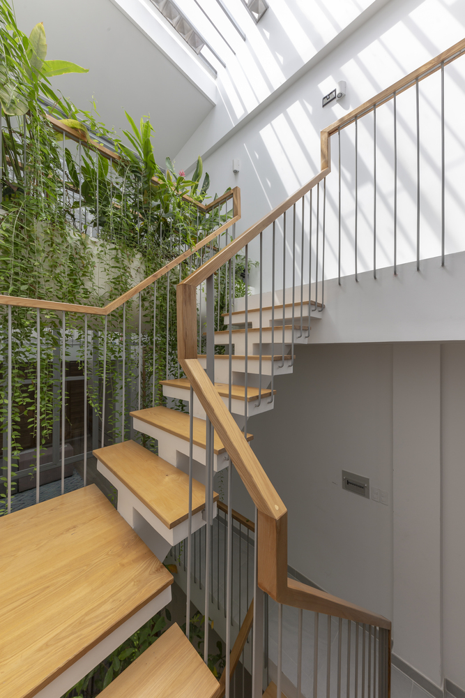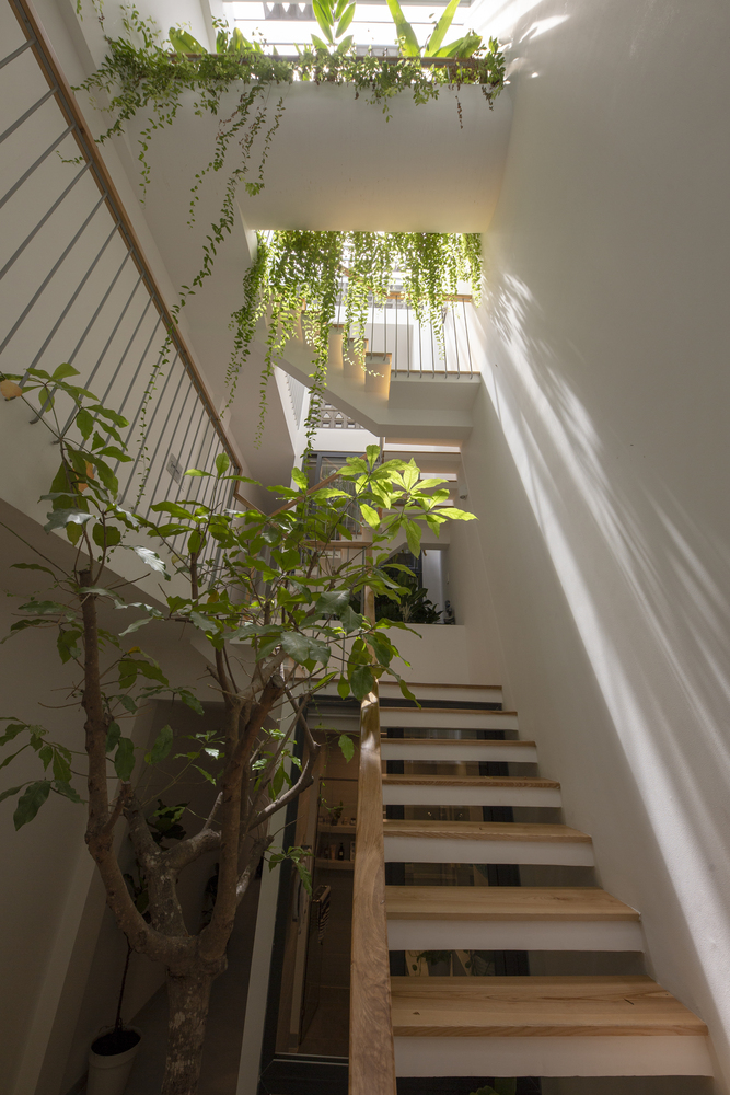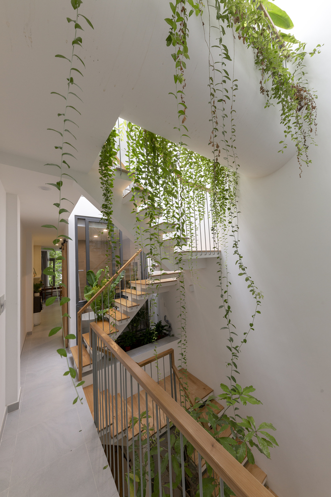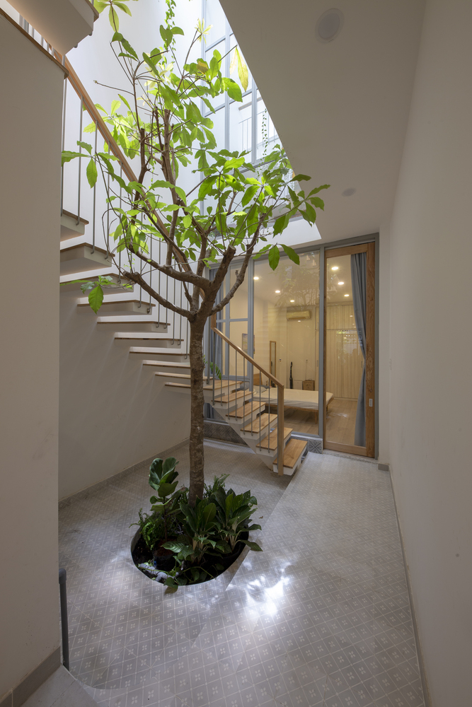Do ít có nhu cầu về không gian sinh hoạt nên Vy Anh House được vát dần về phía trên để giảm diện tích các tầng trên. Kết quả là mặt tiền cong cho phép ánh sáng tự nhiên vào sâu trong ngôi nhà ống dài và hẹp này. Gia chủ có thể tận hưởng tầm nhìn ra ốc đảo bên trong này từ bất kỳ phòng nào trong ngôi nhà của họ.