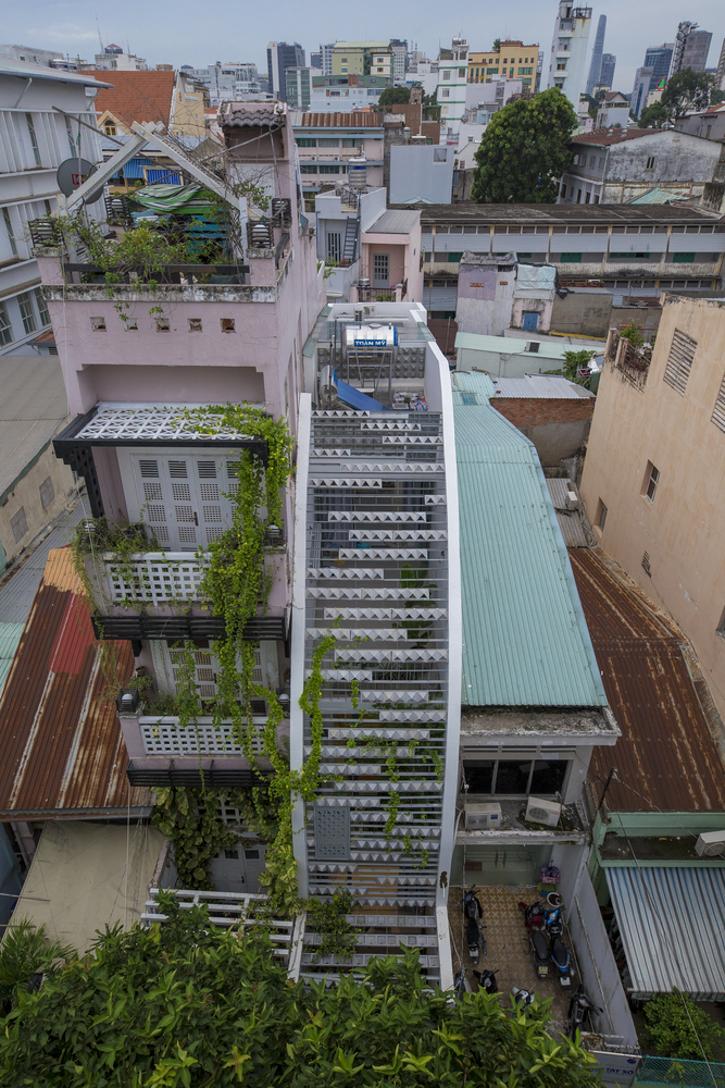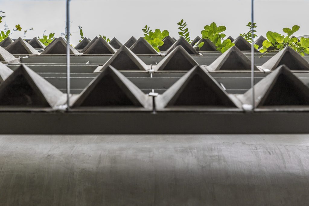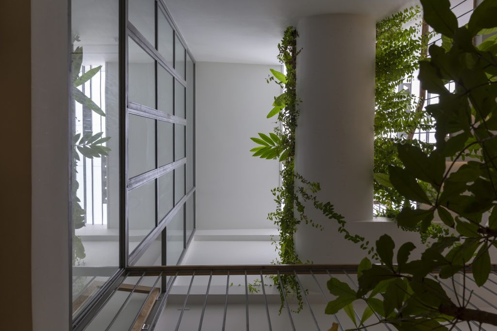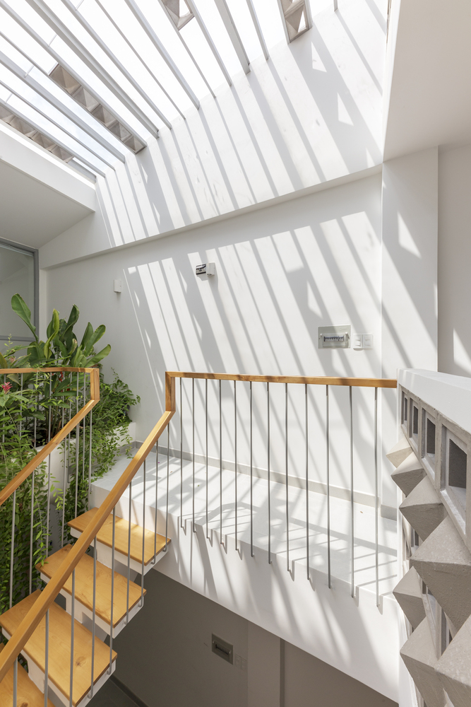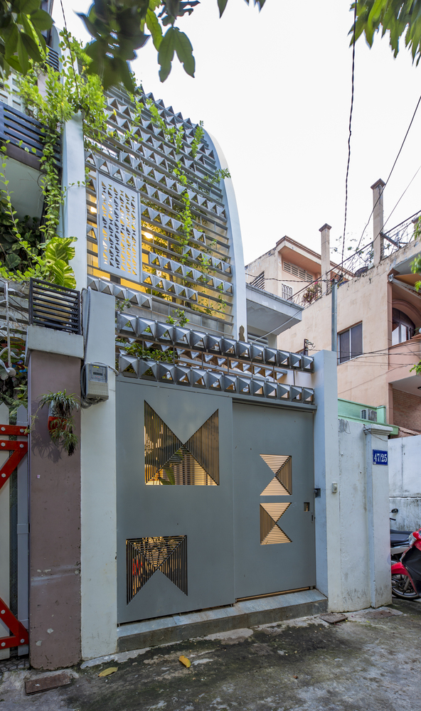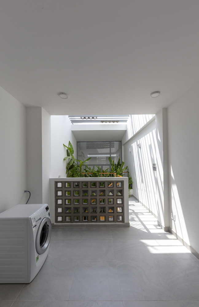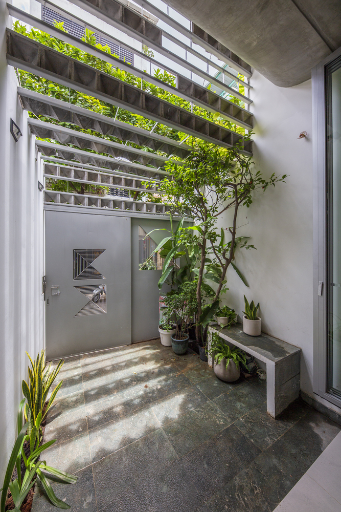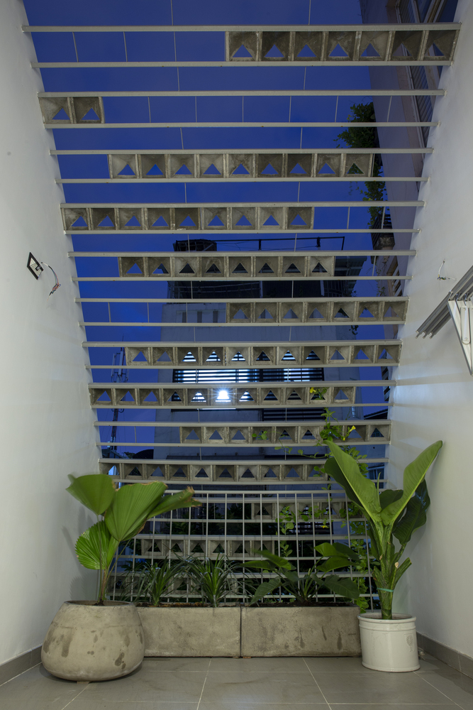 Các viên gạch thông gió trên hệ thống lam chắn gió, được bố trí theo kiểu bất quy tắc, đảm bảo an ninh, thông thoáng và tạo điểm nhấn thẩm mỹ. Hệ thống này cũng hoạt động như một khung xương dần dần sẽ được bao phủ bởi những cây dây leo, kết quả là một bức màn cây xanh mang lại bóng mát và sự riêng tư cho ngôi nhà, như một cái kén giữa đô thị tấp nập xô bồ.