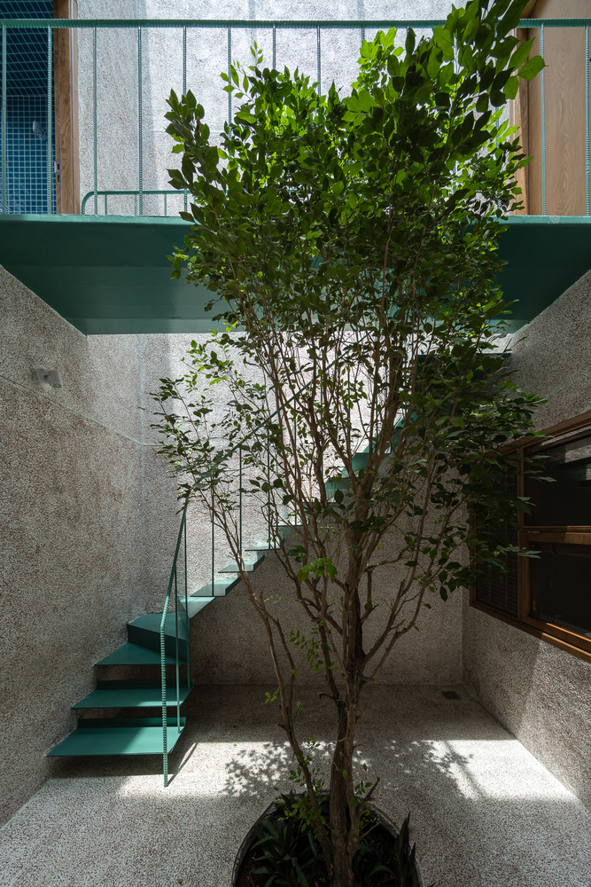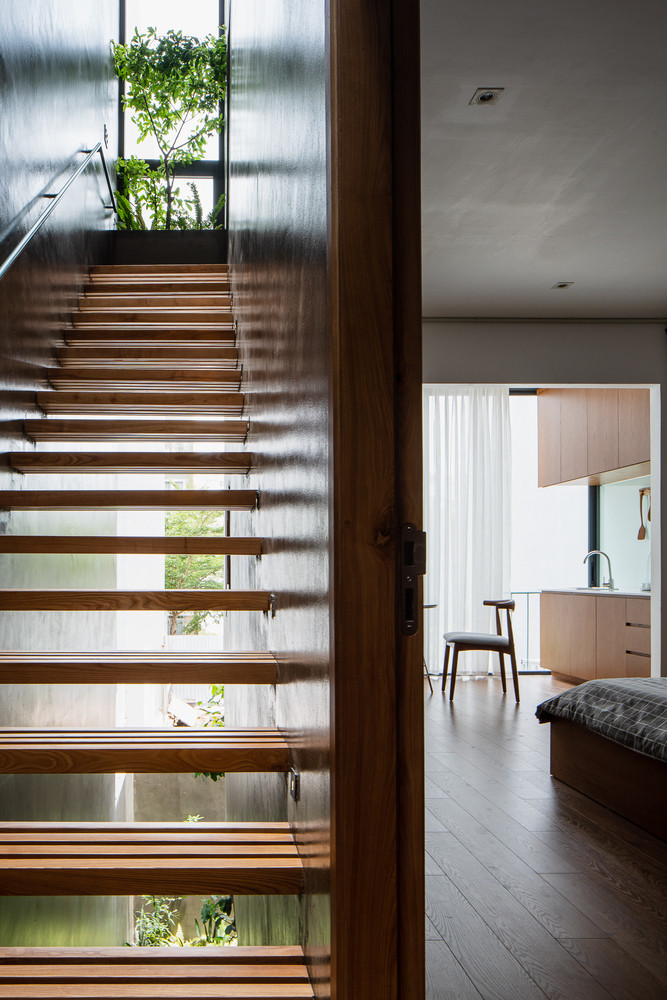 Điểm gây ấn tượng đó chính là cầu thang có cấu trúc như những thanh gỗ được thiết kế dọc theo chiều dài của ngôi nhà. Cầu thang không chỉ là trục giao thông mà còn đóng vai trò thông gió cho tất cả các căn hộ trong ngôi nhà.