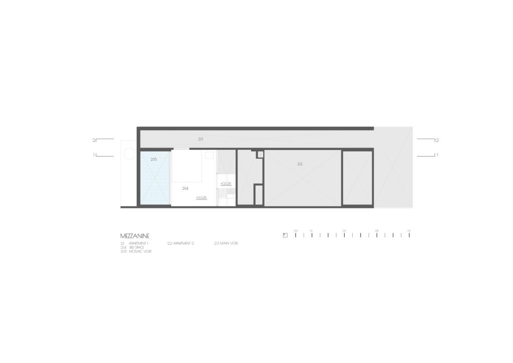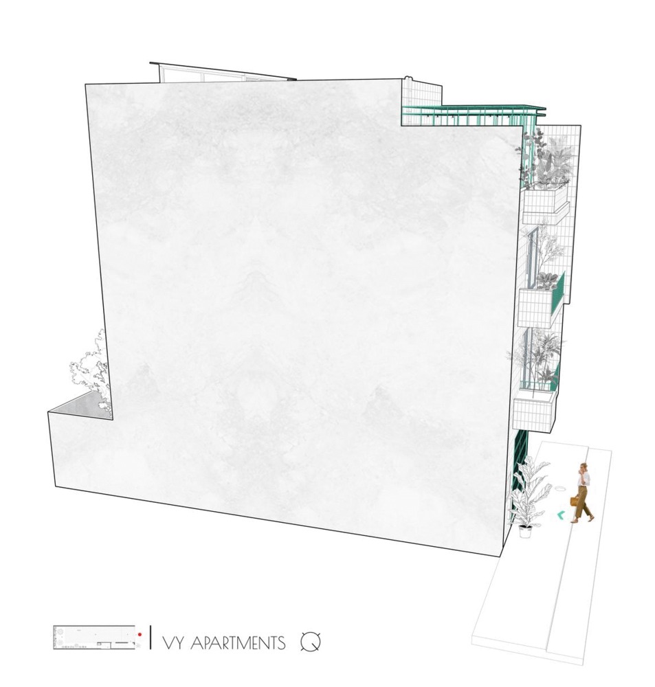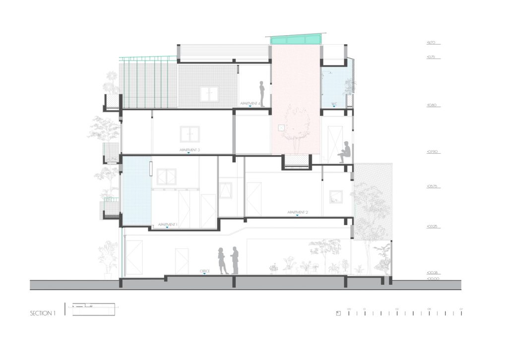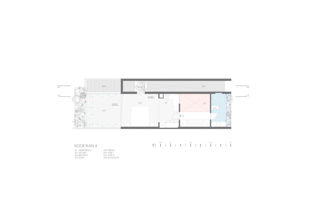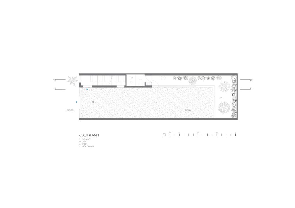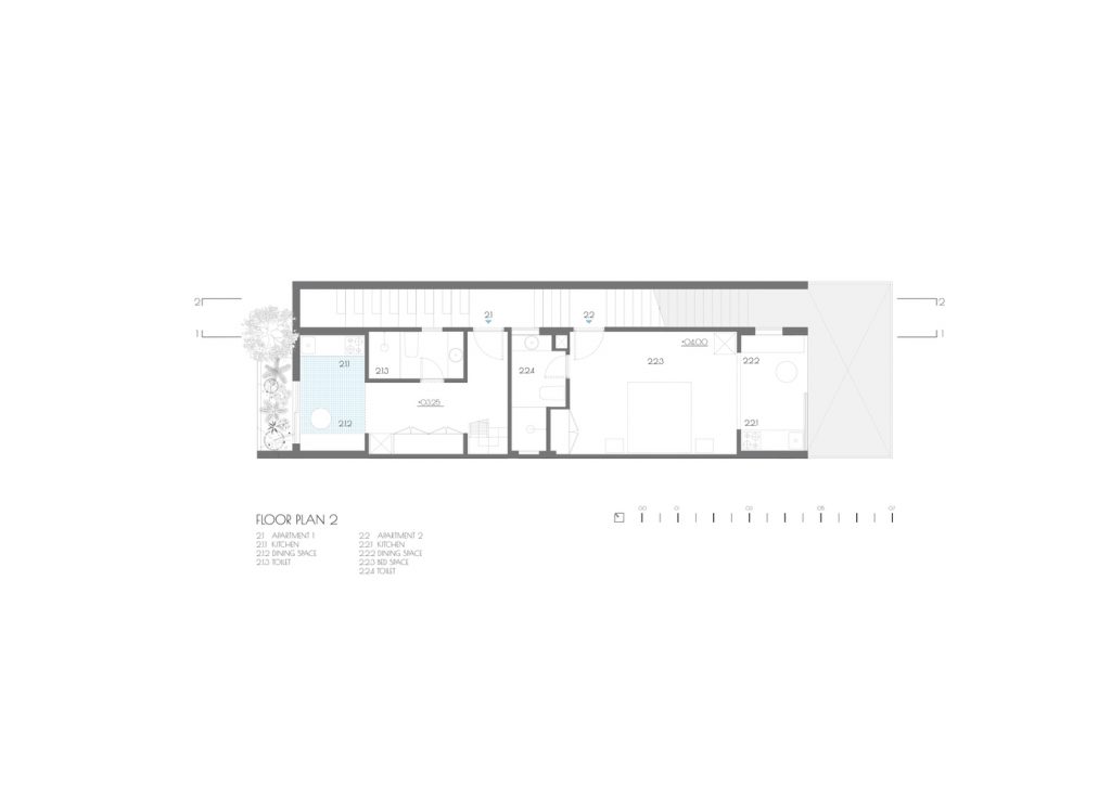Ngôi nhà nằm trong khu đất 5m x 17m, giữa những dãy nhà quy hoạch với quy tắc xây dựng bắt buộc phải tuân theo như chiều cao, khoảng lùi, ban công, v.v… Mục đích là để cho thuê gồm văn phòng ở tầng trệt và 4 căn hộ.