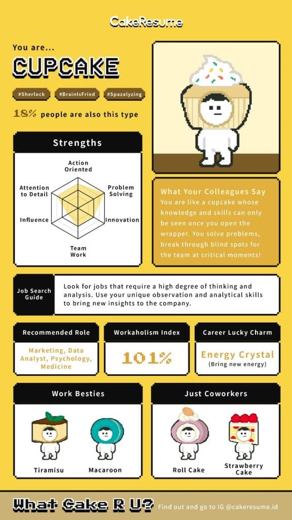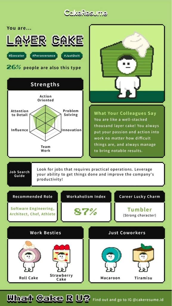 Sử dụng nghệ thuật pixel dễ thương, bài kiểm tra đưa bạn vào một cuộc phiêu lưu nhỏ tại ngôi làng kỳ lạ của những người tìm việc. Trải qua 12 câu hỏi đơn giản, bạn sẽ khám phá được tính cách làm việc của riêng mình. Điều thú vị ở bài test này là người tham gia được mô tả kết quả qua một loại bánh, phản ánh các đặc điểm độc đáo của riêng họ: Bánh nướng nhỏ, Bánh tầng, Macaron, Bánh cuộn, Bánh dâu tây hoặc Tiramisu…