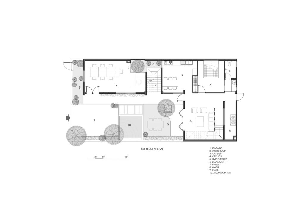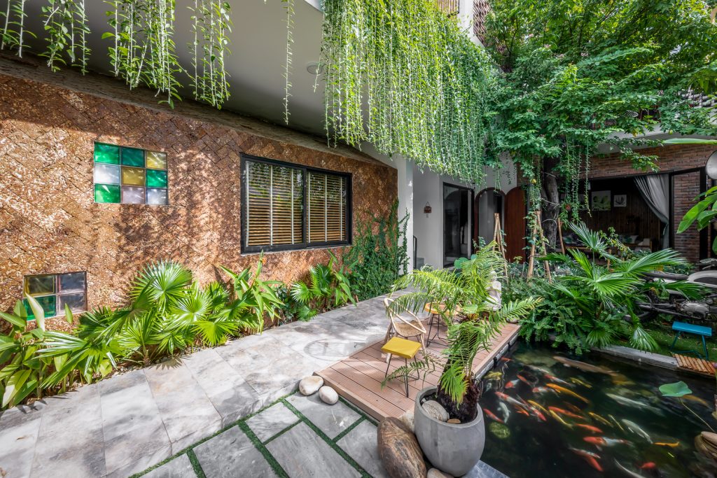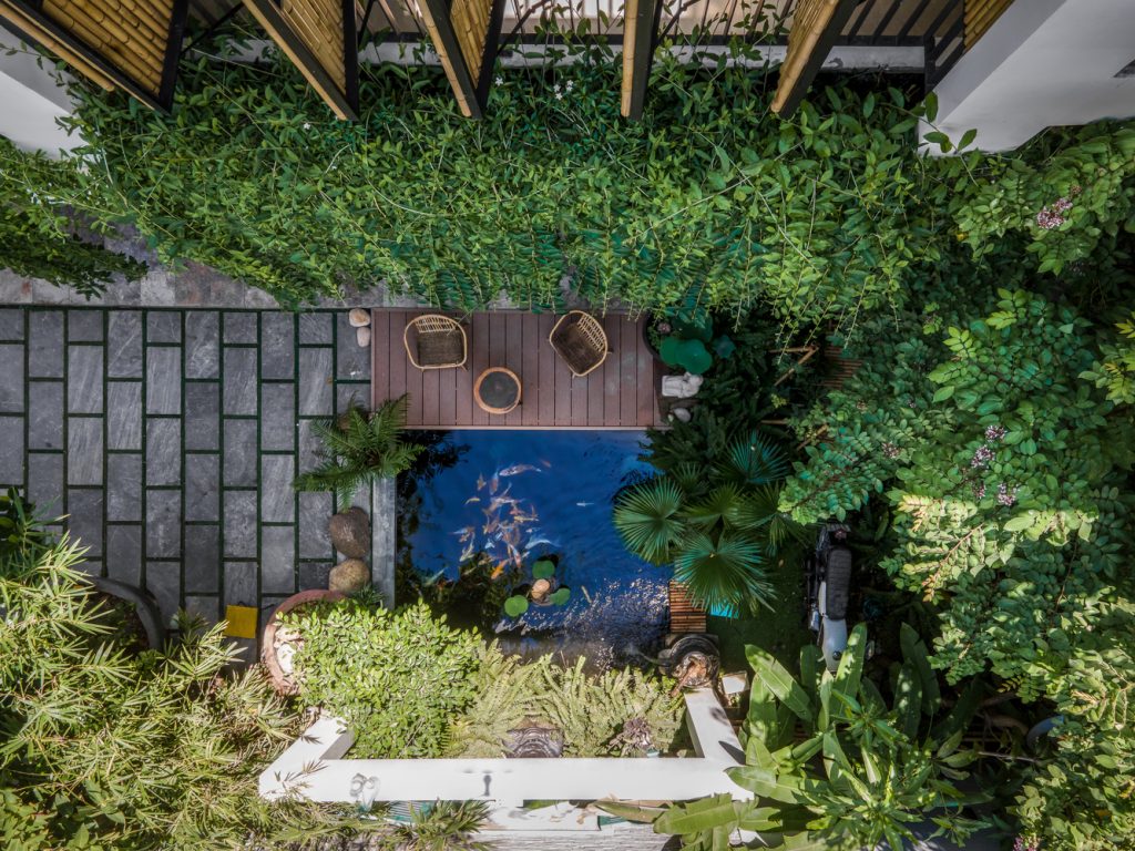 Ngoài ra còn có một khu vườn lớn nằm song song với khu vực làm việc và vuông góc với không gian sống. Ở miền Trung, đặc biệt là Đà Nẵng vào mùa hè luôn có gió phơn rất khô và nóng nên hồ cá Koi được thiết kế đặt trước hướng gió có hơi nước để giảm sức nóng của nguồn gió này.