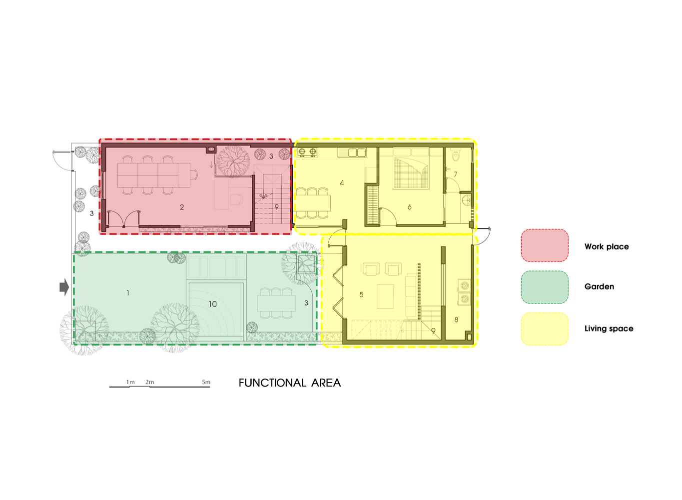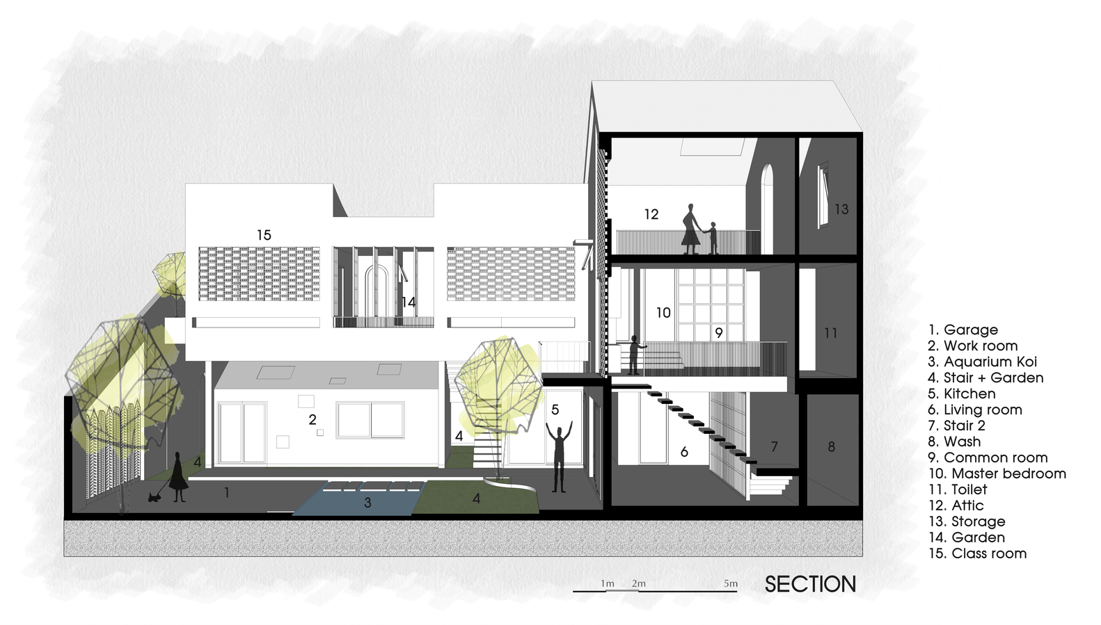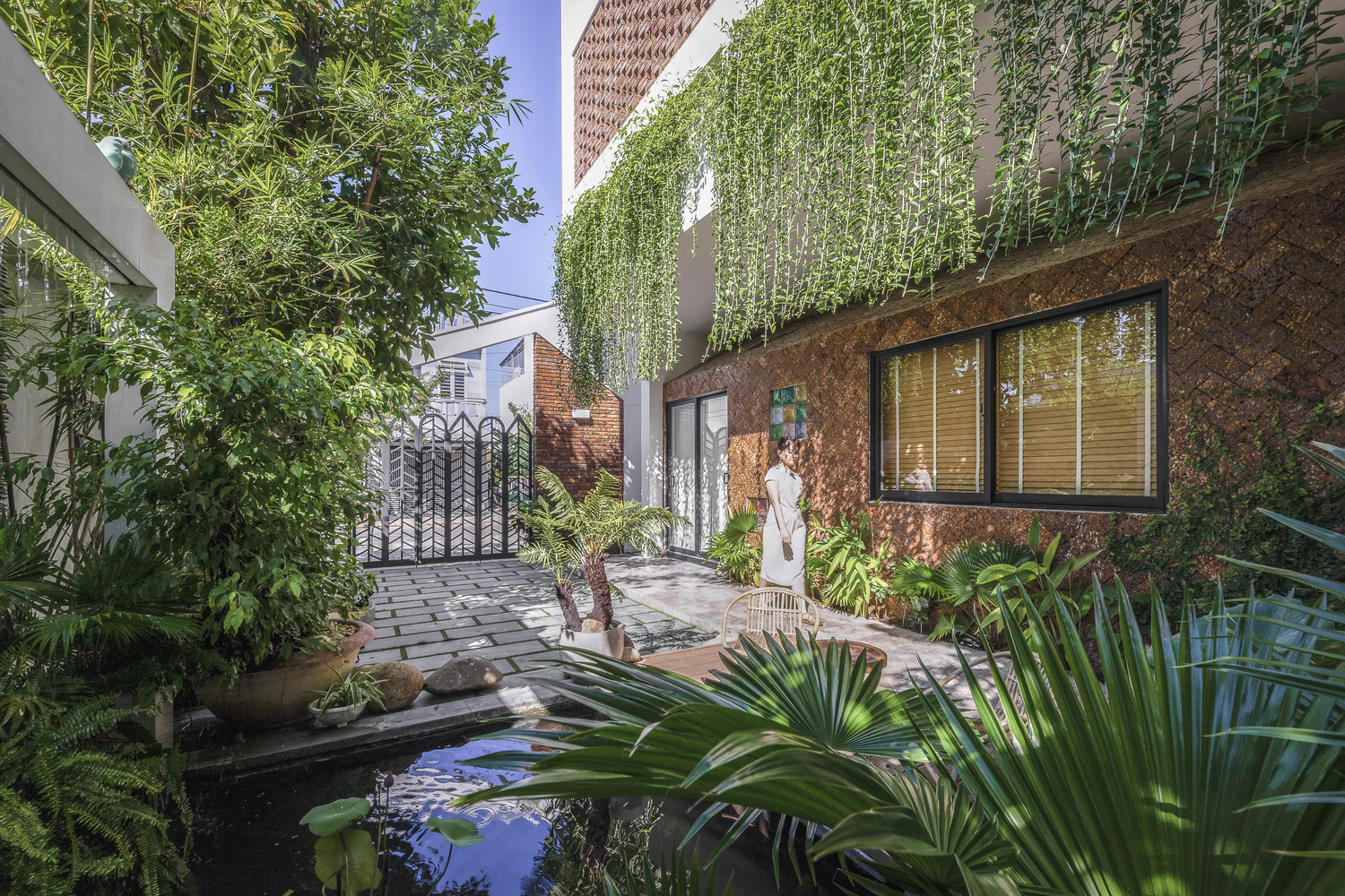 Ngoài ra còn có một khu vườn lớn nằm song song với khu vực làm việc và vuông góc với không gian sống. Ở miền Trung, đặc biệt là Đà Nẵng vào mùa hè luôn có gió phơn rất khô và nóng nên hồ cá Koi được thiết kế đặt trước hướng gió có hơi nước để giảm sức nóng của nguồn gió này.