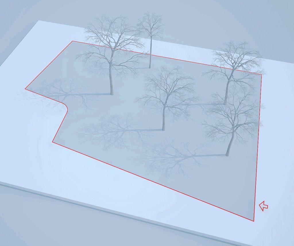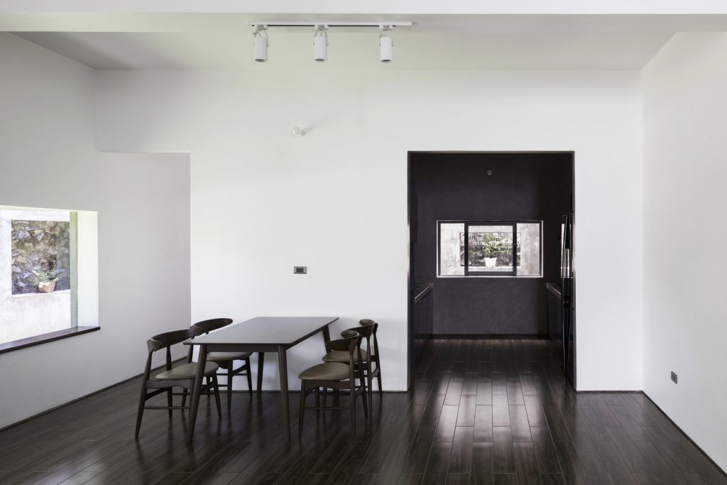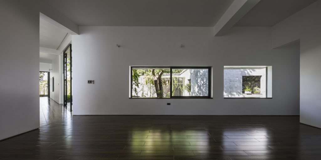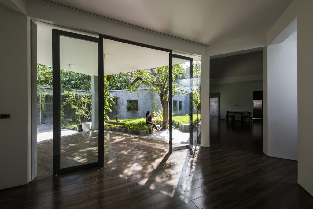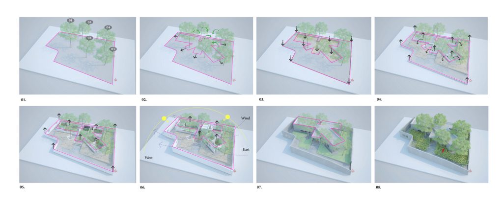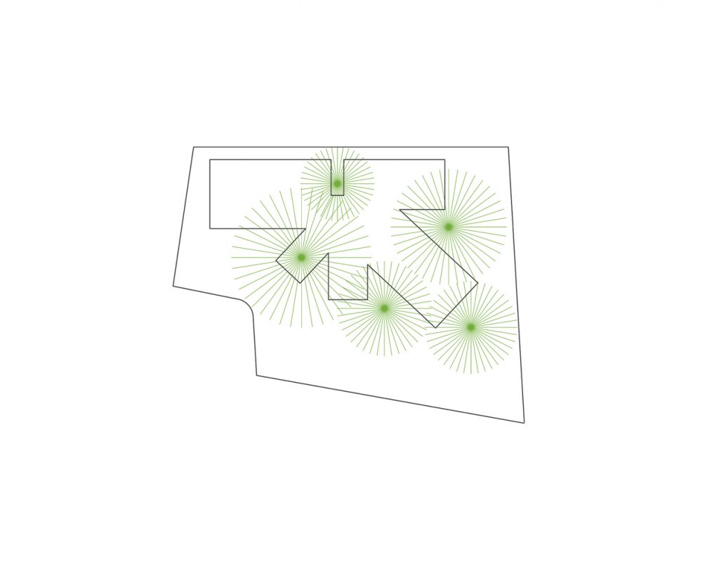 Các khoảng trống được tạo ra giữa các cây lớn, được tính toán để tránh ảnh hưởng đến cây. Tán lá bao phủ toàn bộ không gian được coi như mái nhà thứ hai của công trình. Các không gian bên trong kết nối với nhau bằng hành lang trung tâm của ngôi nhà và khu vườn. Các khối đan xen nhiều mặt tạo nên những khe đón gió hiệu quả cho tòa nhà, thông gió xuyên thấu.