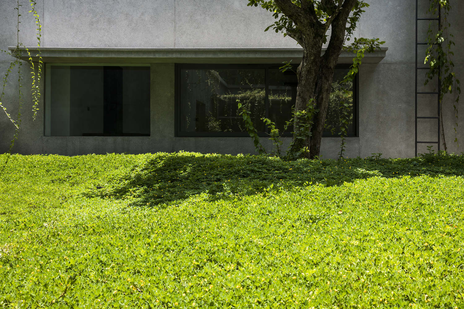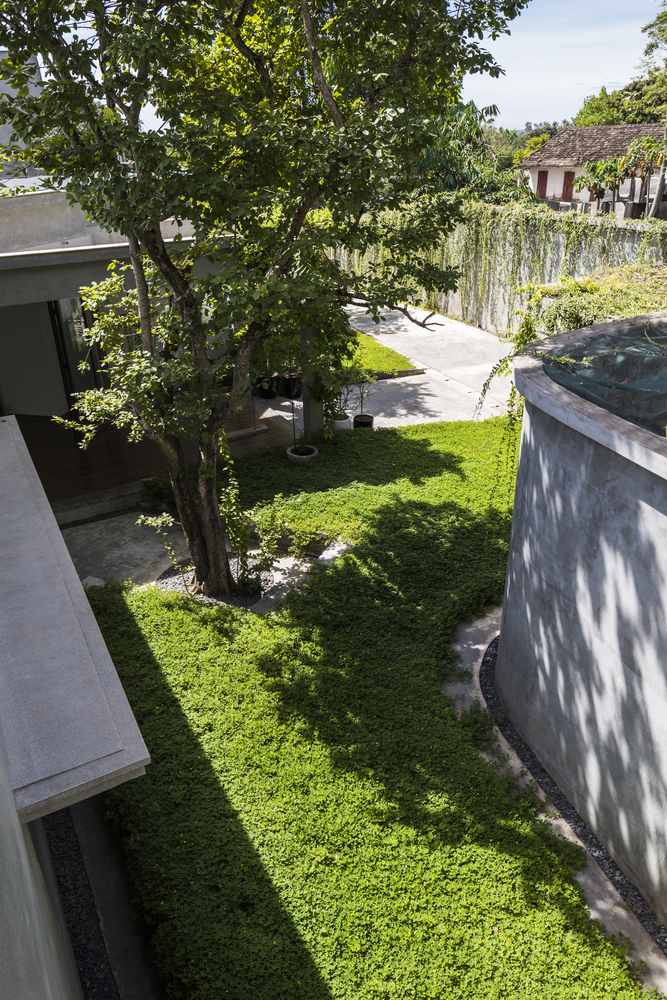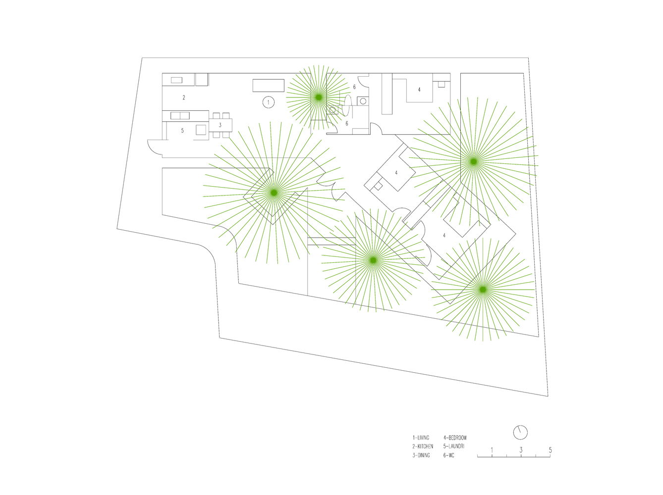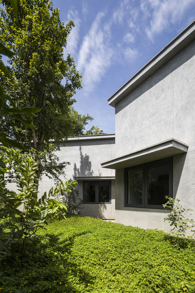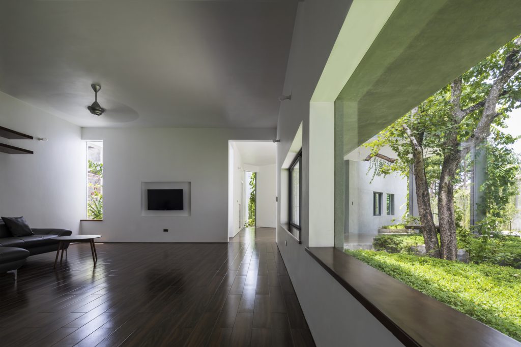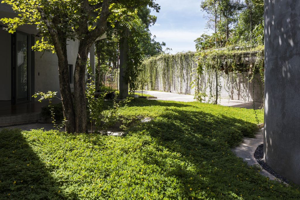 Các khoảng trống được tạo ra giữa các cây lớn, được tính toán để tránh ảnh hưởng đến cây. Tán lá bao phủ toàn bộ không gian được coi như mái nhà thứ hai của công trình. Các không gian bên trong kết nối với nhau bằng hành lang trung tâm của ngôi nhà và khu vườn. Các khối đan xen nhiều mặt tạo nên những khe đón gió hiệu quả cho tòa nhà, thông gió xuyên thấu.