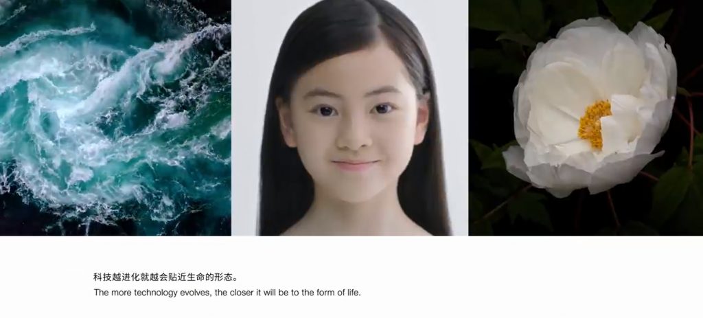 Cuối cùng, nhà thiết kế dẫn dắt người xem về mô tả khái niệm “Alive”. Đó là một video có ba hình ảnh. Hình ảnh chính giữa ghi lại nụ cười của một cô bé, thể hiện cuộc sống của con người. Hình ảnh bên trái cho thấy nhịp điệu của vũ trụ. Mặt biển dậy sóng và trái đất nhô lên từ đường chân trời của mặt trăng chính là nhịp điệu của vũ trụ cách xa thế giới loài người. Bên cạnh đó, sự thay đổi của thực vật cách hoa nở và rụng cho thấy sự khởi đầu và suy thoái của các dạng sống khác biệt với con người. Ba hình ảnh về cuộc sống này được hợp nhất và cân bằng với nhau. Thể hiện khái niệm thiết kế “Alive” – cảm giác của sự sống.