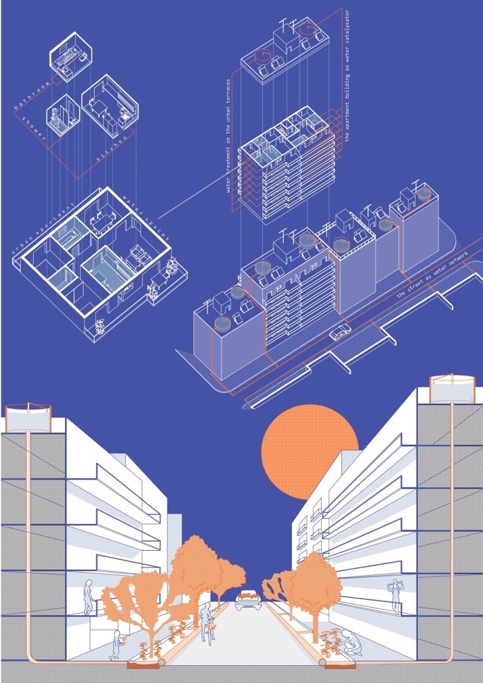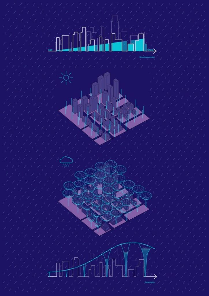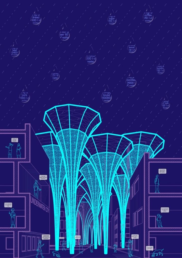 40% dân số hiện nay đang phải chịu đựng sự thiếu nước sạch, và tỉ lệ này không ngừng tăng lên. Sự phát triển của công nghiệp đã gia tăng sự tiêu thụ nước khổng lồ cùng với sự ô nhiễm, khiến thế kỷ 21 đang dần trở thành 1 kỷ nguyên của sự đấu tranh cho nước sạch. Dự án tập trung vào giải quyết vấn đề lãng phí nước. Những cột dạng phễu giúp thu nước mưa được đặt tại trung tâm cộng đồng, từ đó giúp nâng cao nhận thức của người dân xung quanh về tầm quan trọng của việc bảo vệ và dự trữ nước. Cấu trúc này trở thành những chiếc ô ngược, thay vì bảo vệ người dân khỏi ướt mưa, hệ thống giúp thu gom nước cho nhiều mục đích sử dụng khác nhau. Những mặt nước lơ lửng trên không trung như một ẩn dụ về “thành phố dưới nước”.