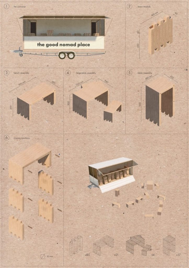 Lấy cảm hứng từ những chiếc xe du mục phục vụ lễ hội, ăn uống cho cộng đồng, dự án hướng đến việc thiết kế những chiếc xe ‘chở’ không gian công cộng đến nhiều địa điểm khác nhau trong thành phố. Bàn ghế được thiết kế theo module tháo ghép giúp linh hoạt trong việc vận chuyển và sắp xếp, bài trí không gian. Từ đó, cư dân có thêm những sự kiện thường nhật để tận hưởng cuộc sống, đó có thể là một buổi chiếu phim, một sân khấu văn nghệ, một hội chợ ẩm thực, hay tranh luận và đóng góp ý kiến cho những dự án mới của địa phương. Cùng với nhau…