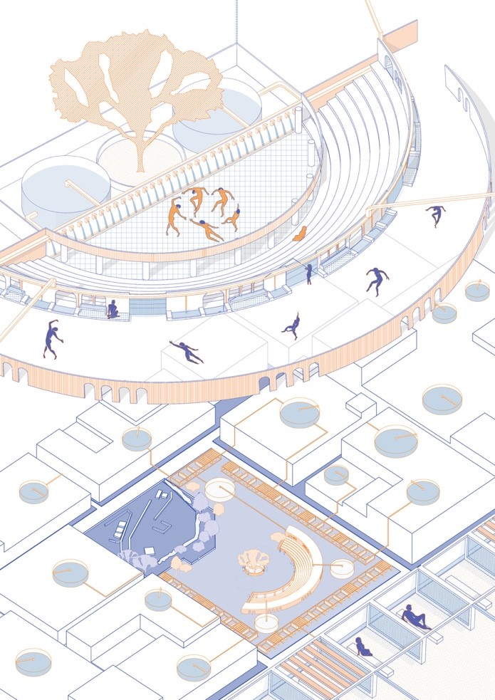 Trong mối quan hệ cộng sinh đó, nguồn nước ở khu sinh hoạt chung với lối thiết kế mô phỏng lại khu quảng trường Hy Lạp xưa giúp mang đến thêm nhiều trải nghiệm sống cho người dân. Với nhiều lớp không gian cùng cách xử lý nước khác nhau, sự tương tác cộng đồng sẽ được gia tăng đáng kể. Ở vòng ngoài cùng, nước đóng vai trò làm mát và chuyển tiếp vào bên trong. Tiếp đó, nước trở thành yếu tố trang trí, làm sạch cho không gian. Ở trung tâm, những vòi nước róc rách tuôn chảy như một biểu hiện của sự sống từ bao đời nay giúp thu hút và kết nối mọi người bất kể khác biệt về sắc tôc, tôn giáo…