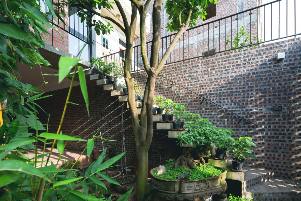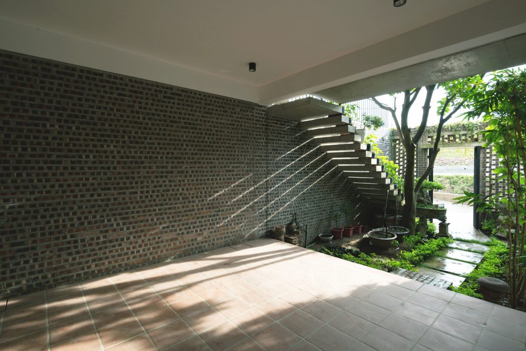 Để đảm bảo sự riêng tư cho ngôi nhà cũng như tránh khói bụi từ môi trường, KTS đã xây tường rào cao như chân tường của ngôi nhà, sử dụng vật liệu và kỹ thuật gạch đỏ thô tạo không gian thoáng đãng để thông gió và lấy ánh sáng tự nhiên cho toàn bộ không gian tầng một.