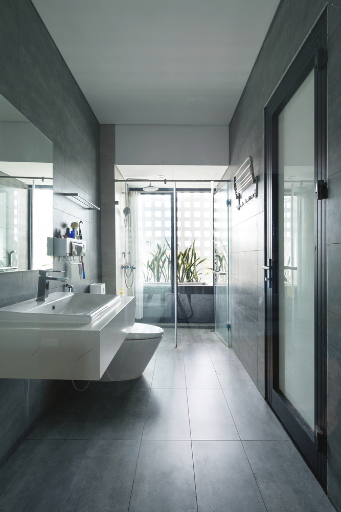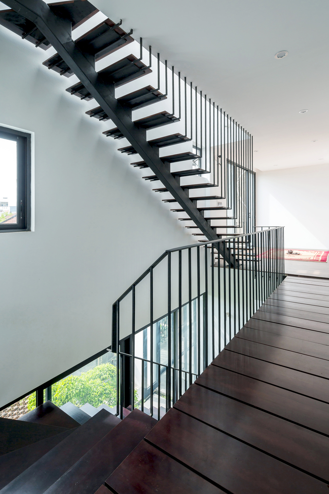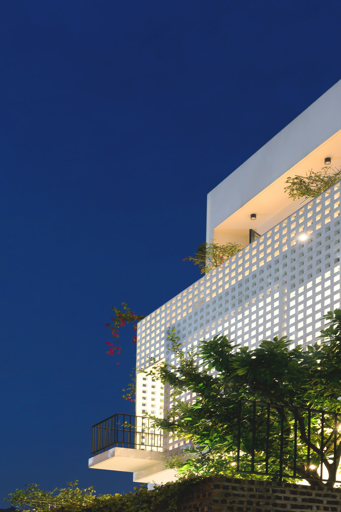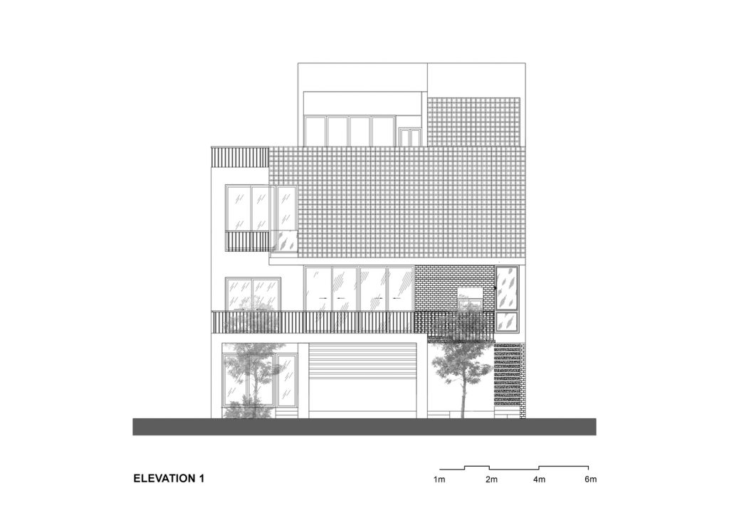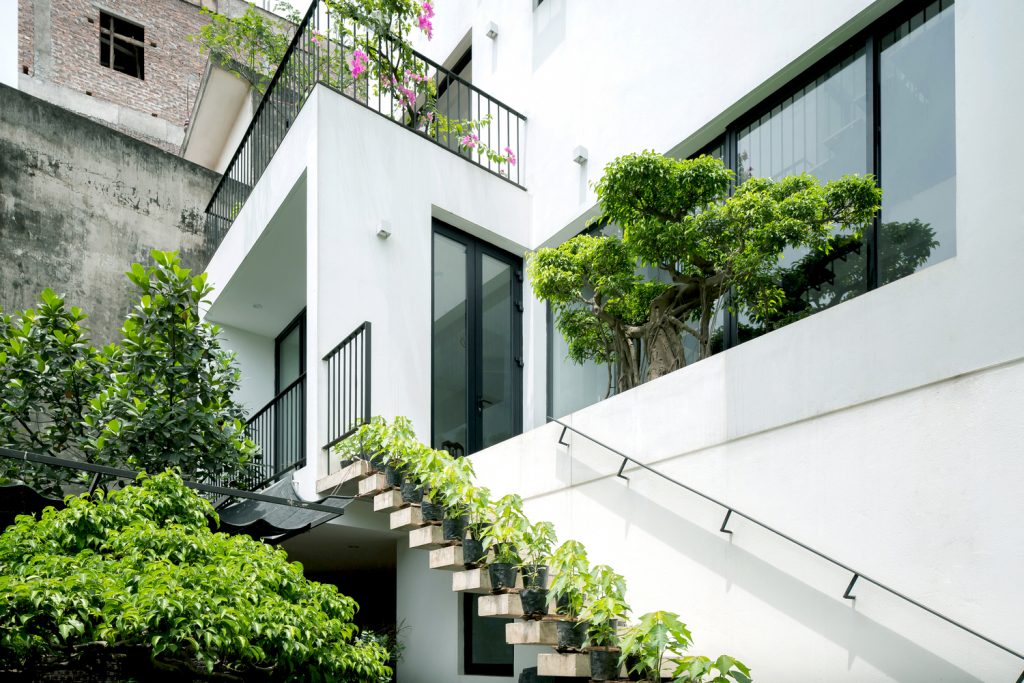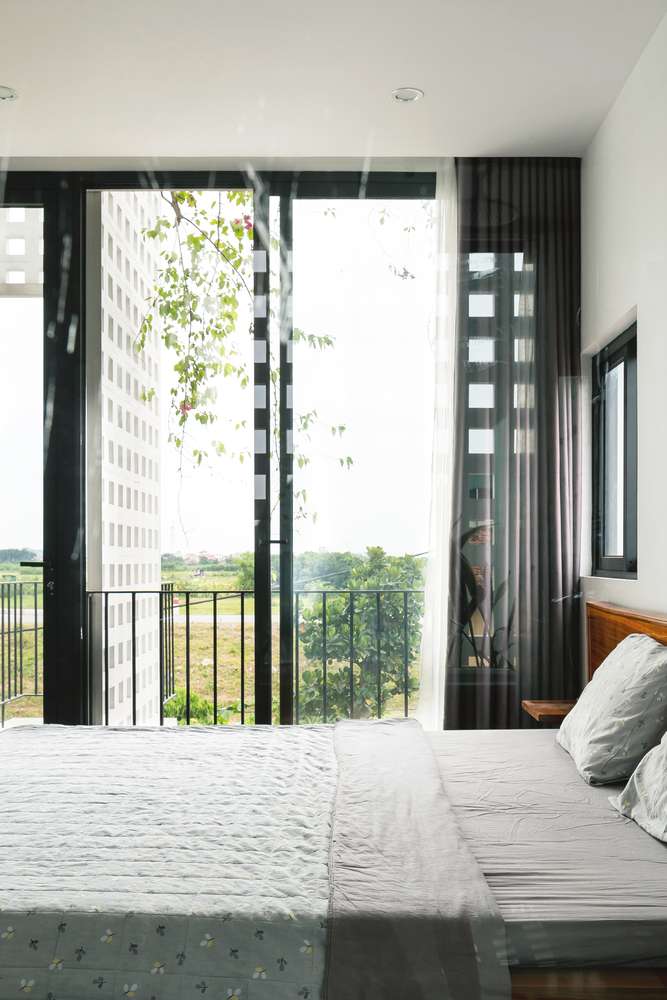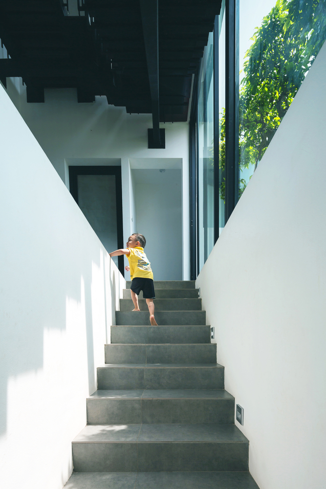 Việc xử lý hình khối và 2 lớp mặt tiền không chỉ góp phần tạo nên tính thẩm mỹ cho ngôi nhà, giúp không gian bên trong tránh được bức xạ trực tiếp từ hướng Tây mà vẫn giao thoa với thiên nhiên bên ngoài.