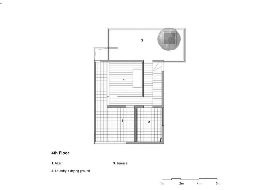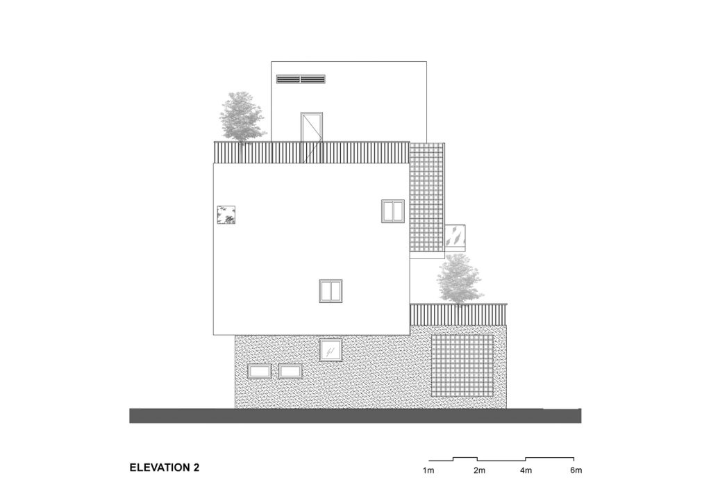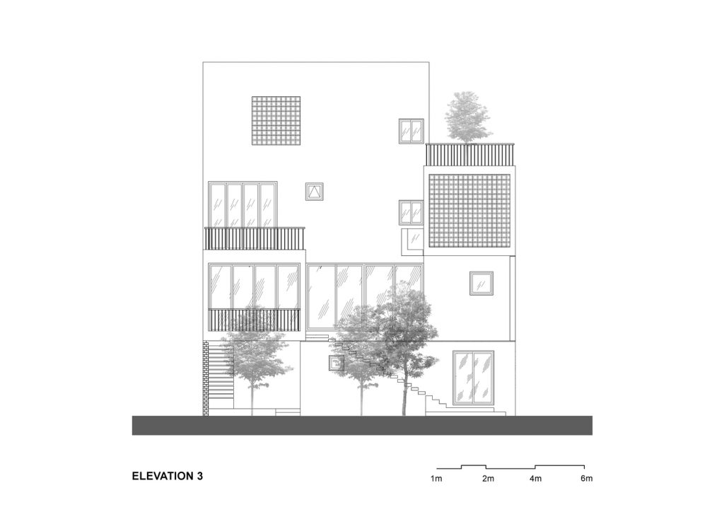 Cùng với việc phân tách các không gian chức năng chung và riêng cho cả hộ gia đình là việc giải quyết phối cảnh kiến trúc cho cả công trình với cốt nền thấp hơn cao độ mặt đường (2,5 – 4m). KTS đã đưa ra giải pháp đẩy toàn bộ không gian chức năng lên tầng 2 và tầng 3 sử dụng thủ thuật mượn không gian bên ngoài là không gian phía sau và mặt tiền hướng ra sườn đê, giải phóng toàn bộ tầng 1 làm không gian chung, nhà để xe, sân vườn.