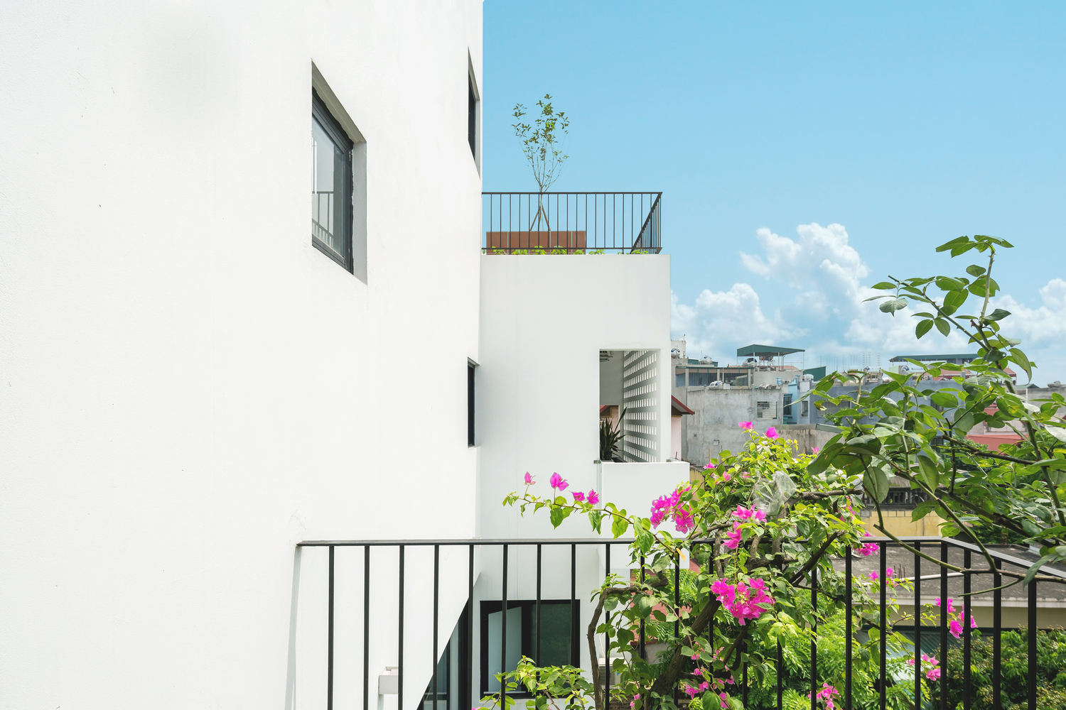 Việc xử lý hình khối và 2 lớp mặt tiền không chỉ góp phần tạo nên tính thẩm mỹ cho ngôi nhà, giúp không gian bên trong tránh được bức xạ trực tiếp từ hướng Tây mà vẫn giao thoa với thiên nhiên bên ngoài.
