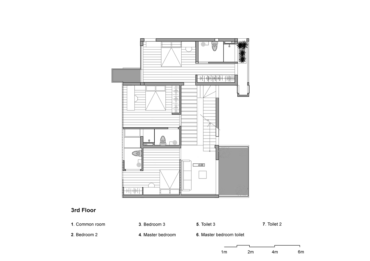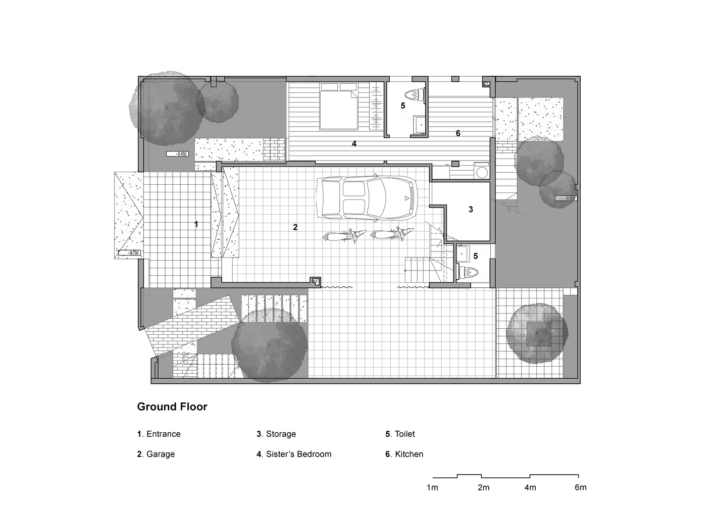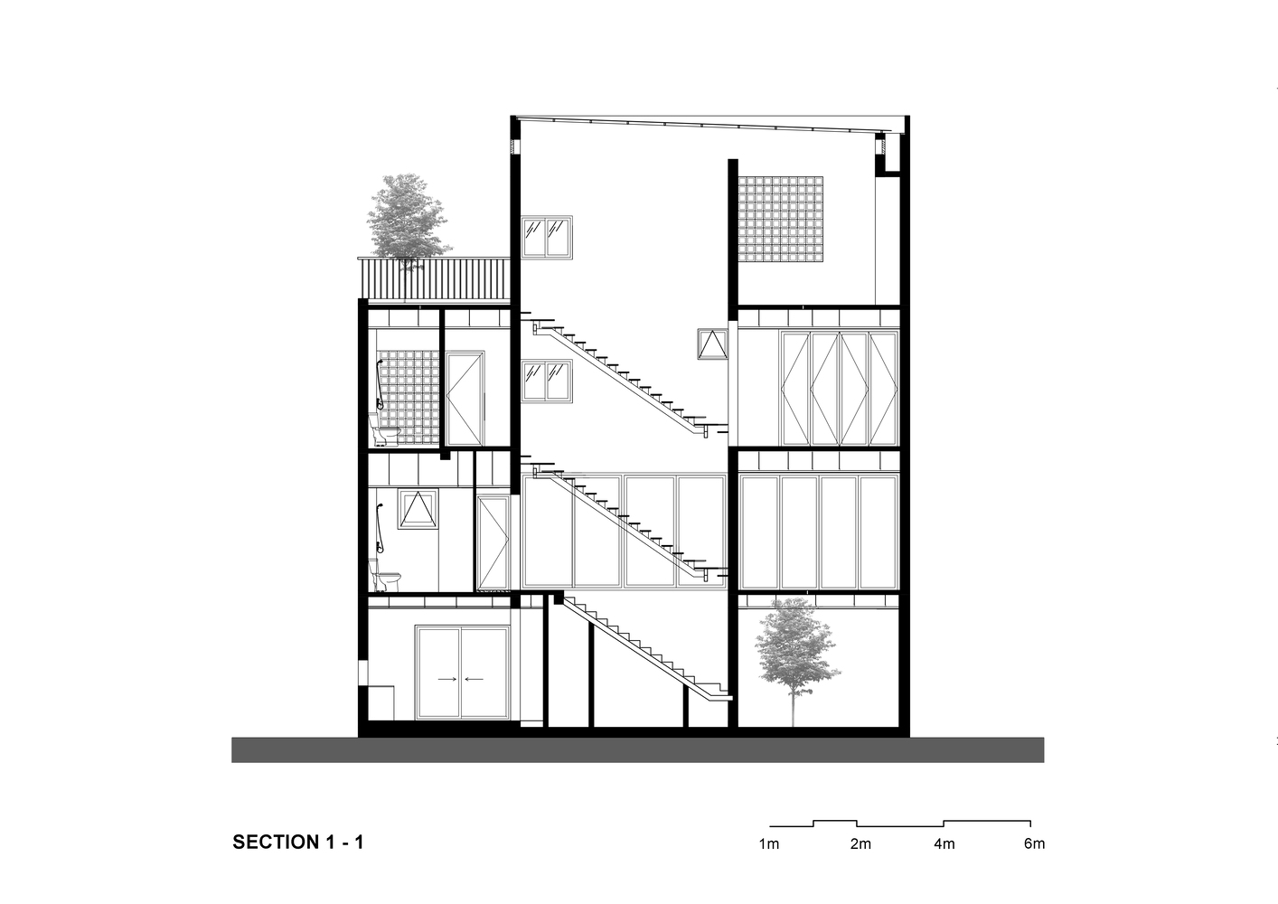 Được thiết kế dành cho hai gia đình trẻ, ba thế hệ và tám nhân khẩu sinh sống, là một hộ gia đình có truyền thống văn hóa đồng bằng Bắc Bộ, yêu thích không gian thoáng đãng, nhiều cây xanh và gió. Ngôi nhà chia không gian chức năng thành 4 khối chính và 4 tầng, được thiết kế đan xen các khối kiên cố tạo khoảng trống bao quanh bằng các vật liệu thông gió tạo sự kết nối, đưa nắng gió vào công trình.