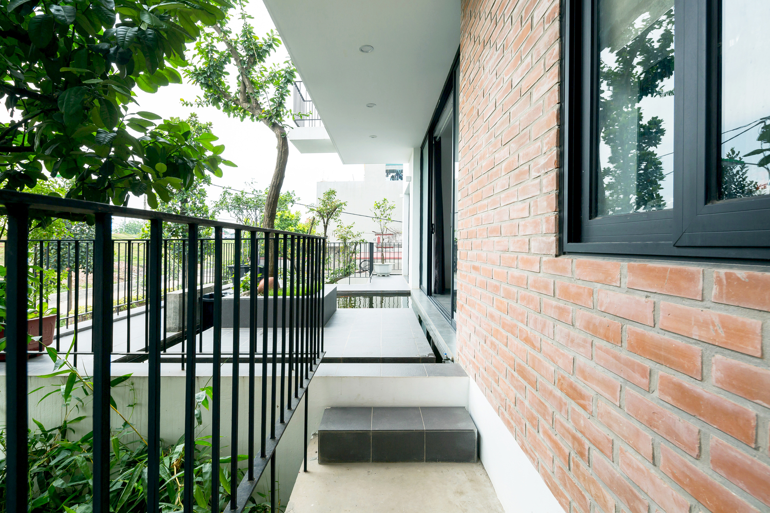 Để đảm bảo sự riêng tư cho ngôi nhà cũng như tránh khói bụi từ môi trường, KTS đã xây tường rào cao như chân tường của ngôi nhà, sử dụng vật liệu và kỹ thuật gạch đỏ thô tạo không gian thoáng đãng để thông gió và lấy ánh sáng tự nhiên cho toàn bộ không gian tầng một.