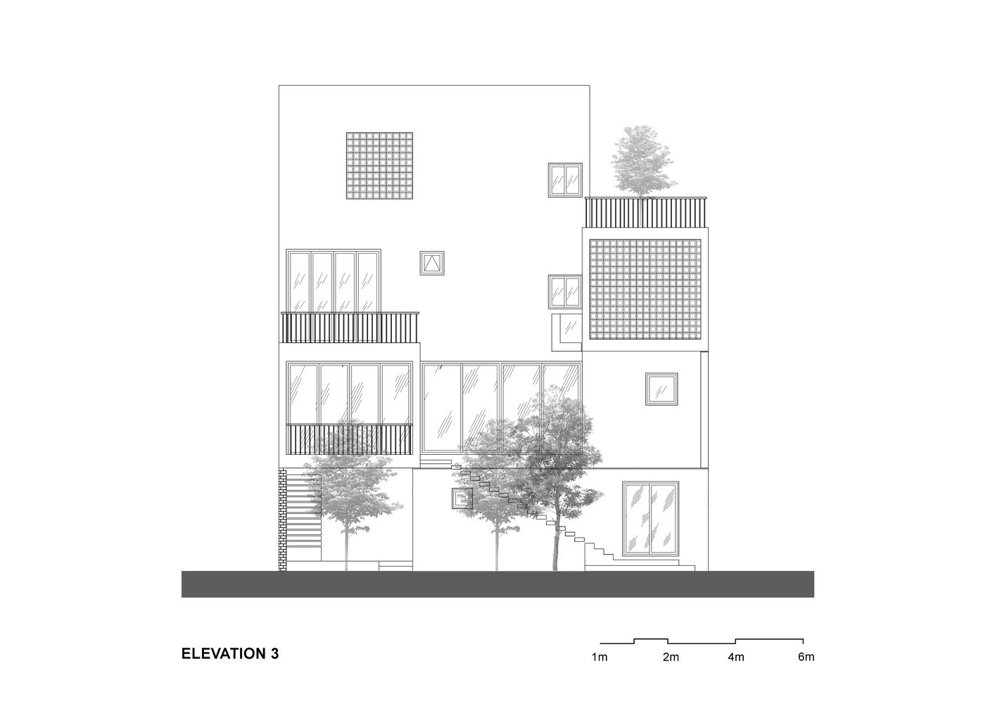 Cùng với việc phân tách các không gian chức năng chung và riêng cho cả hộ gia đình là việc giải quyết phối cảnh kiến trúc cho cả công trình với cốt nền thấp hơn cao độ mặt đường (2,5 – 4m). KTS đã đưa ra giải pháp đẩy toàn bộ không gian chức năng lên tầng 2 và tầng 3 sử dụng thủ thuật mượn không gian bên ngoài là không gian phía sau và mặt tiền hướng ra sườn đê, giải phóng toàn bộ tầng 1 làm không gian chung, nhà để xe, sân vườn.