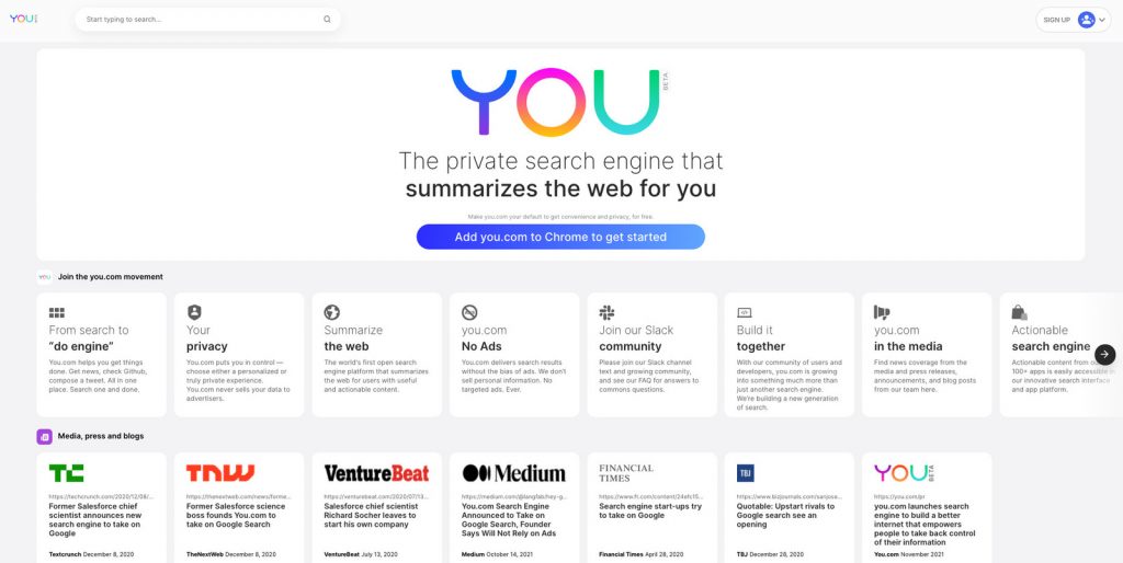 Khi nói đến công cụ tìm kiếm thì chắc hẳn hầu như ai cũng nghĩ đến Google đầu tiên. Tuy nhiên, gã khổng lồ này không phải là lựa chọn duy nhất. Nếu bạn cảm thấy nhàm chán với cách hiển thị của Google hay mệt mỏi với những quảng cáo cứ đeo bám bạn trên mọi nền tảng khác sau mỗi lần tìm kiếm thứ gì đó, thì giờ đây bạn có thể thử một công cụ tìm kiếm mới khác biệt hơn có tên là You ở địa chỉ You.com.
