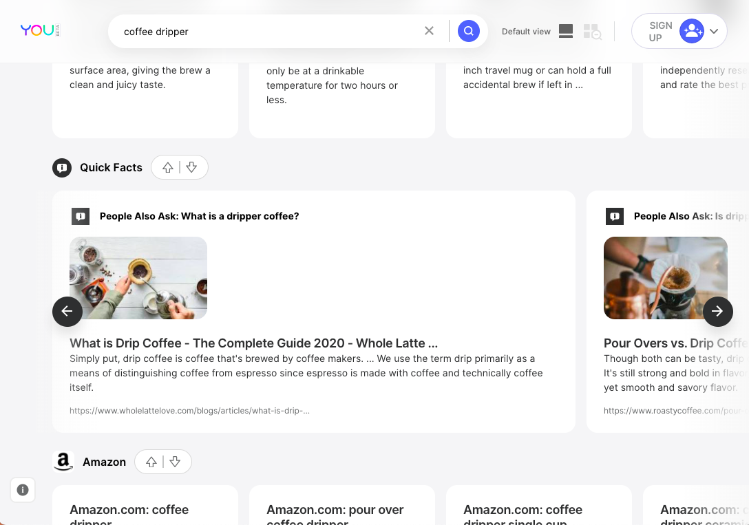 Không giống như hầu hết các công cụ tìm kiếm khác, You sẽ hiển thị kết quả tìm kiếm trong những bảng nằm ngang được gọi là “apps”, thay vì danh sách theo dạng dọc truyền thống. Kết quả hiển thị trên các bảng này được sắp xếp theo các trang web — ví dụ một bảng kết quả dành cho Twitter, một bảng cho Amazon, và một bảng cho Reddit, v.v. Thông qua các tìm kiếm này, người dùng sau đó có thể bỏ phiếu “up” hoặc “down” trên từng bảng để cá nhân hóa các kết quả hiển thị trong tương lai, ưu tiên cho các nguồn ưa thích của mình trước tiên.