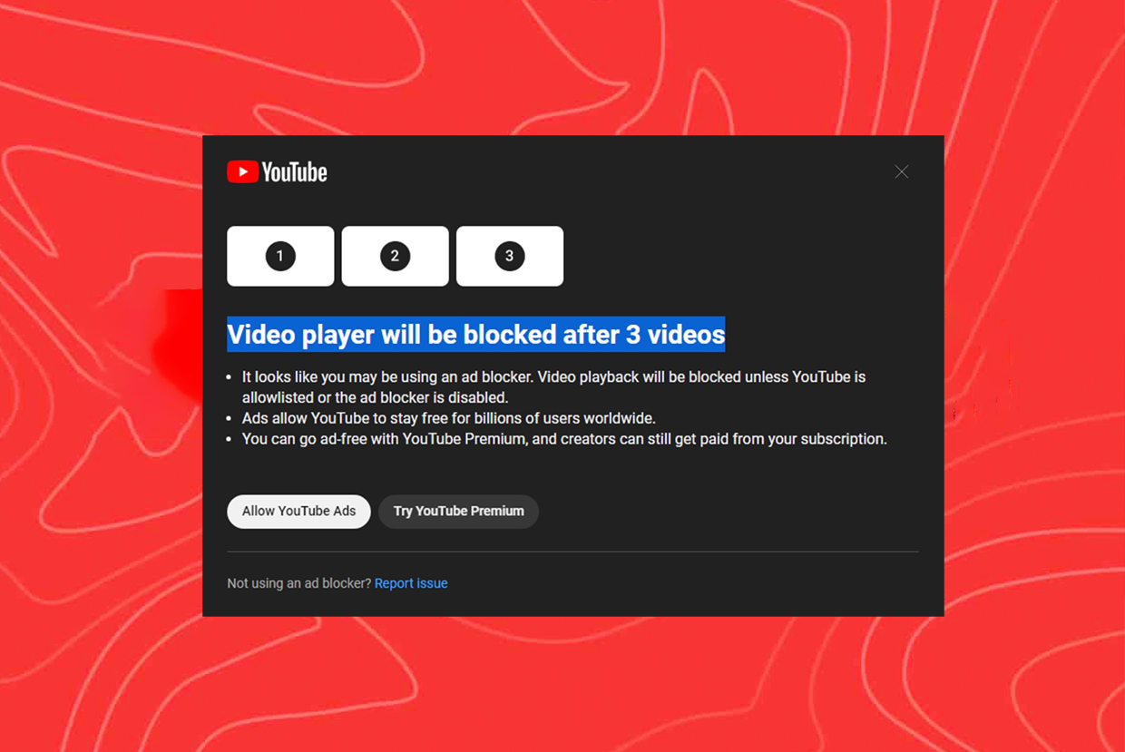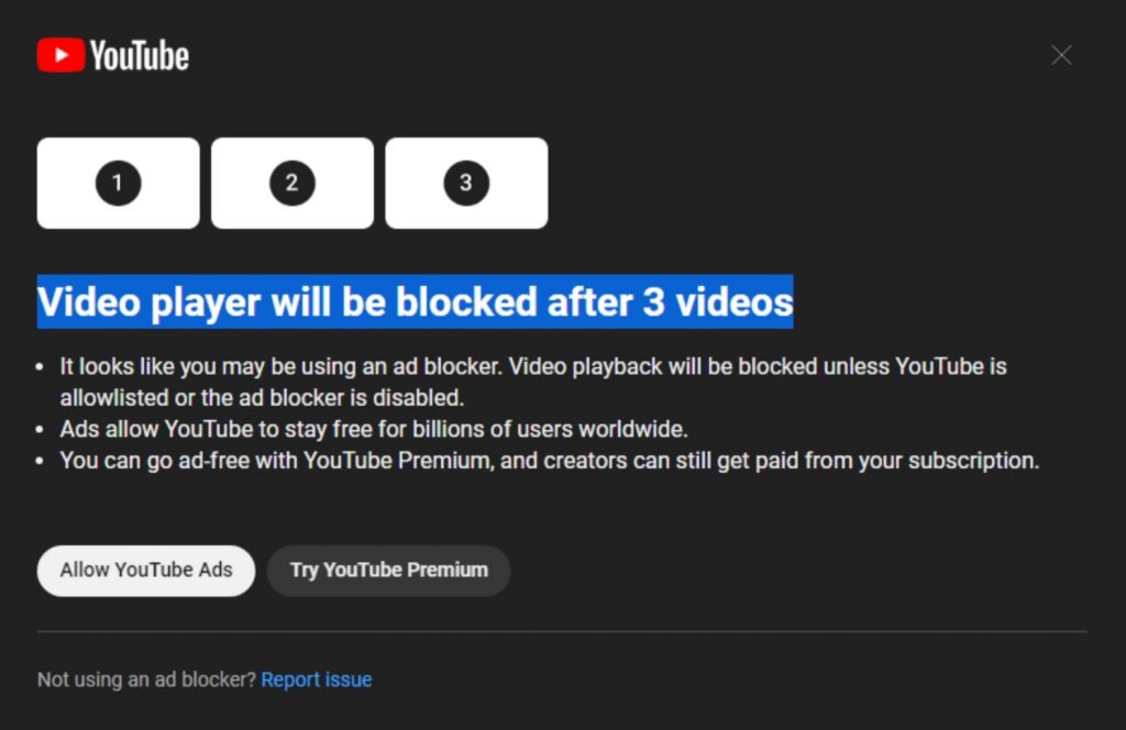 Trên diễn đàn Reddit, thành viên Reddit_n_Me chia sẻ ảnh chụp thông báo của YouTube trên máy tính, cảnh cáo khả năng phát video trên nền tảng sẽ bị khóa nếu người này xem 3 video trong lúc bật công cụ chặn quảng cáo.